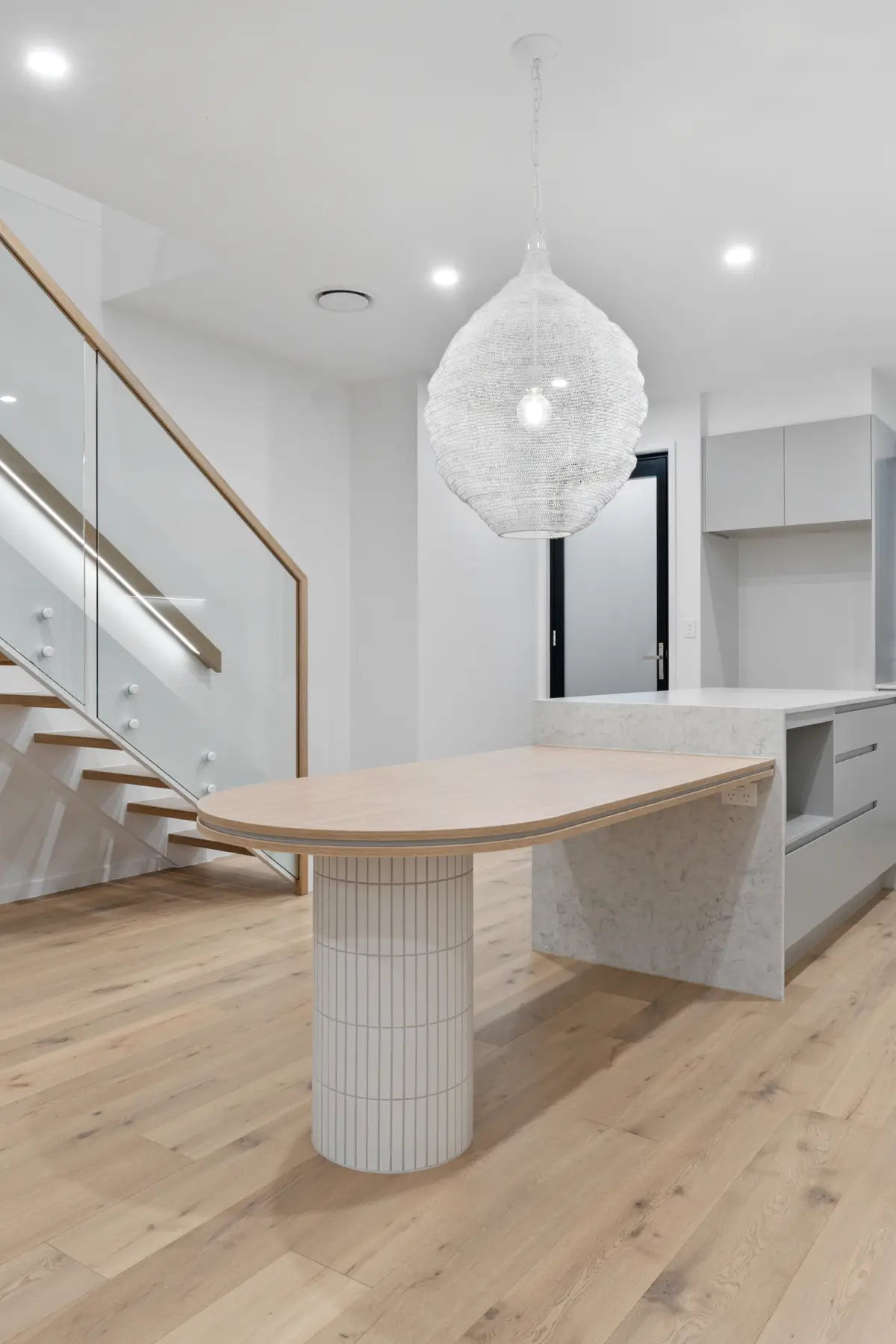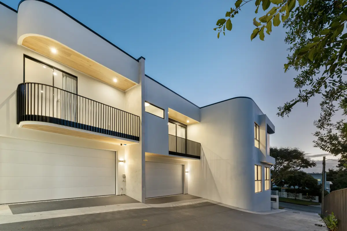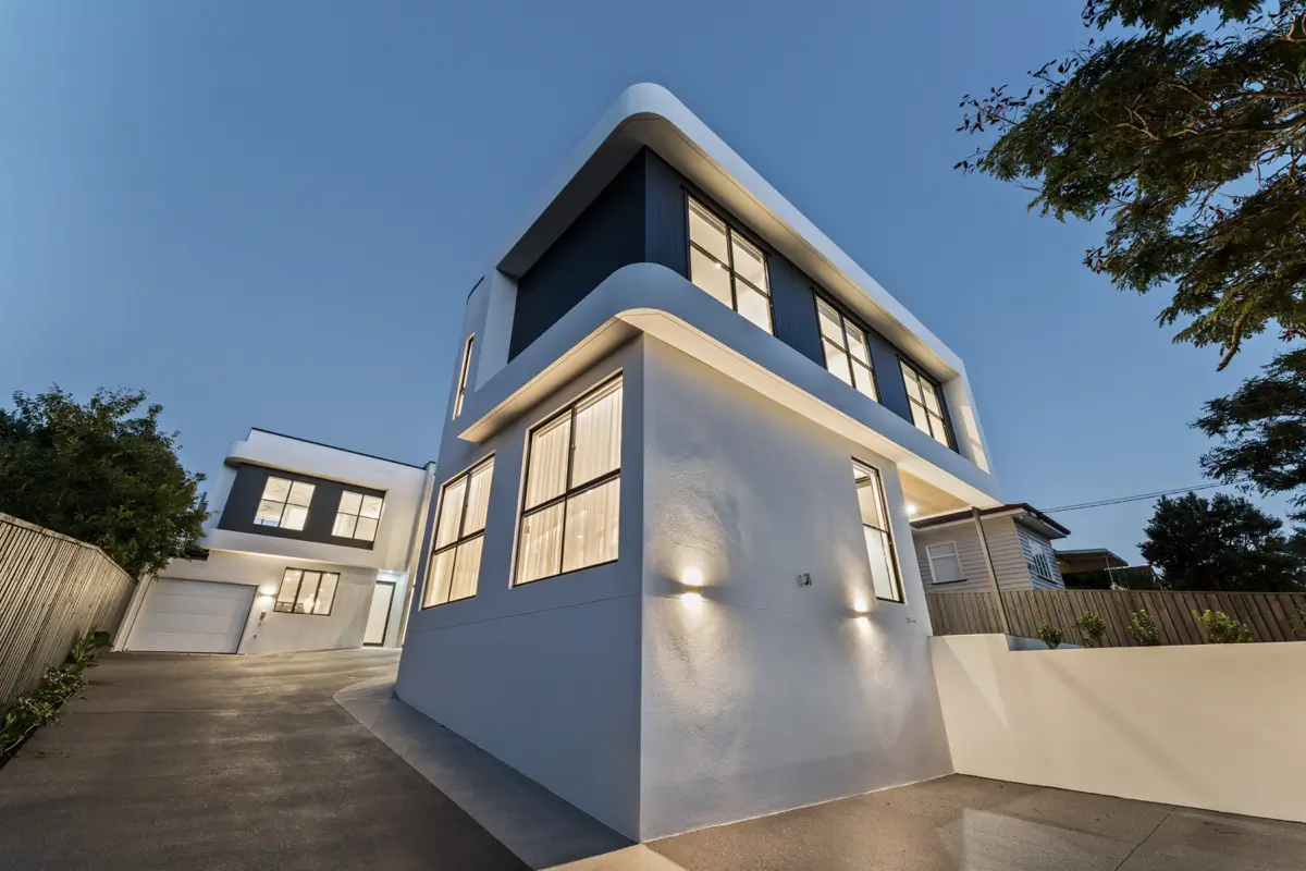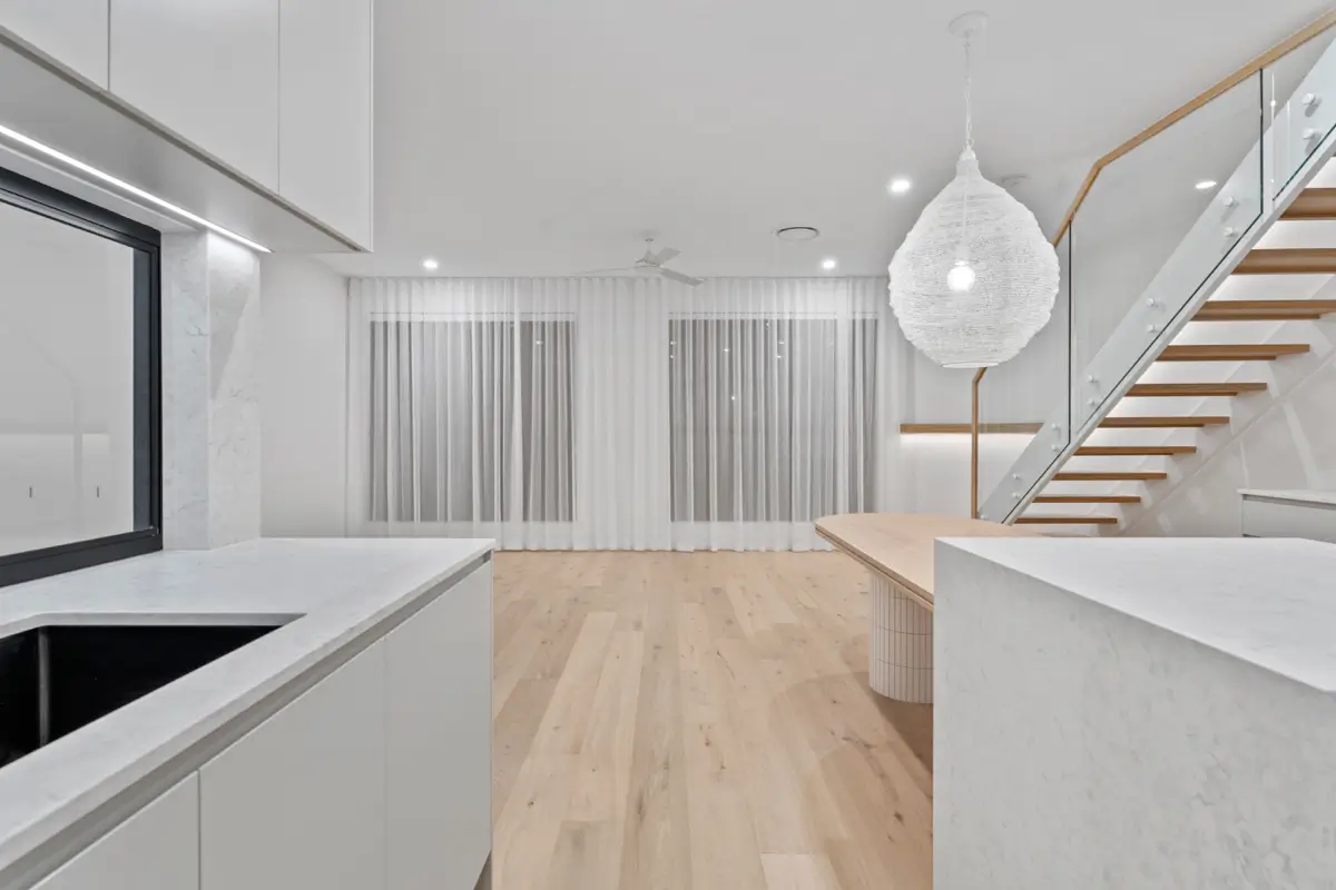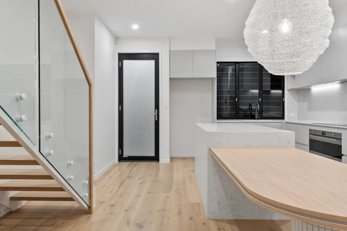 East House presents luxury townhomes designed to maximise space, style, and comfort on a sloped site. Each residence has been carefully planned to make the most of the natural topography, incorporating tandem or double garages and generous multi-level living that feels both efficient and expansive.