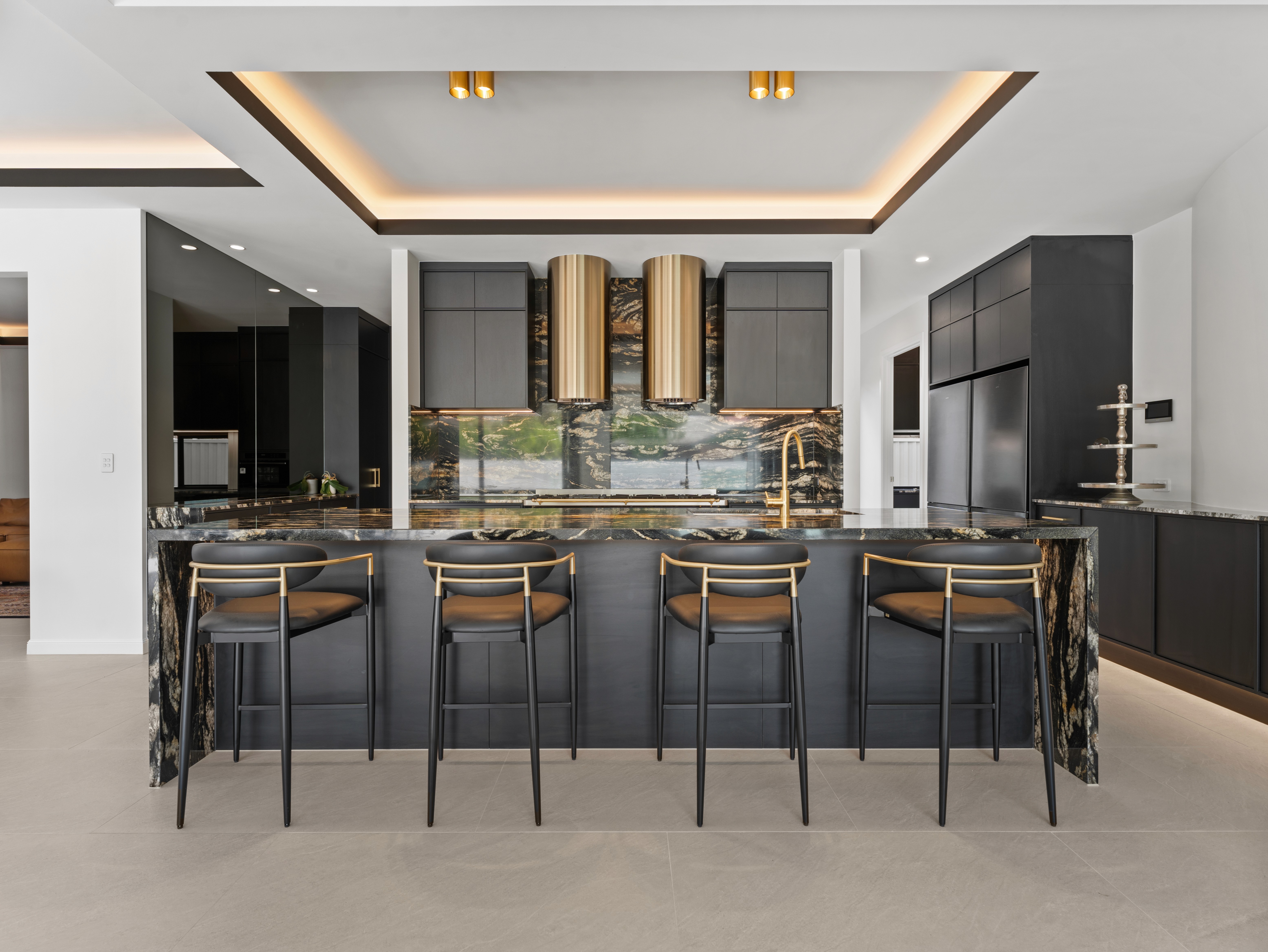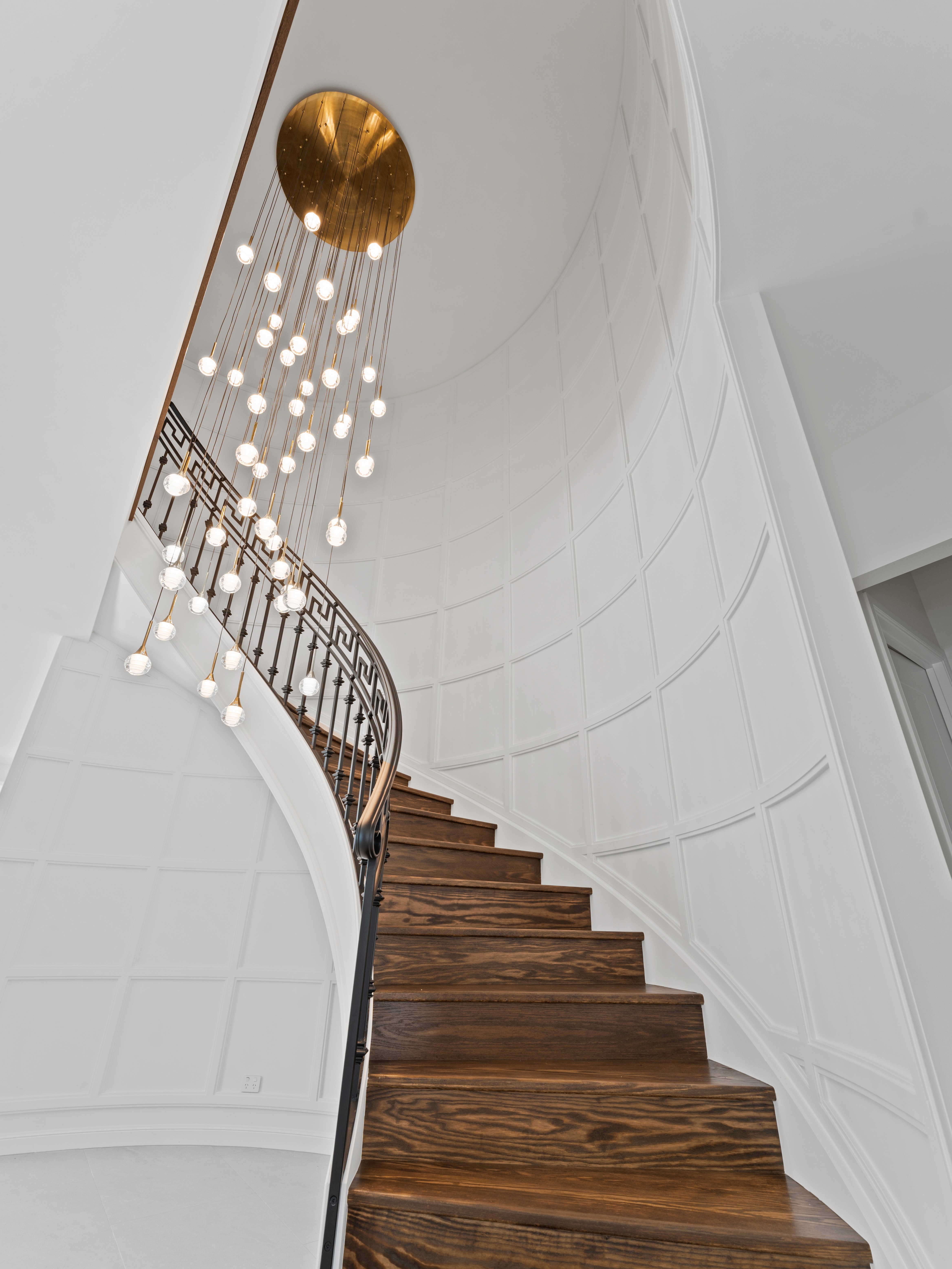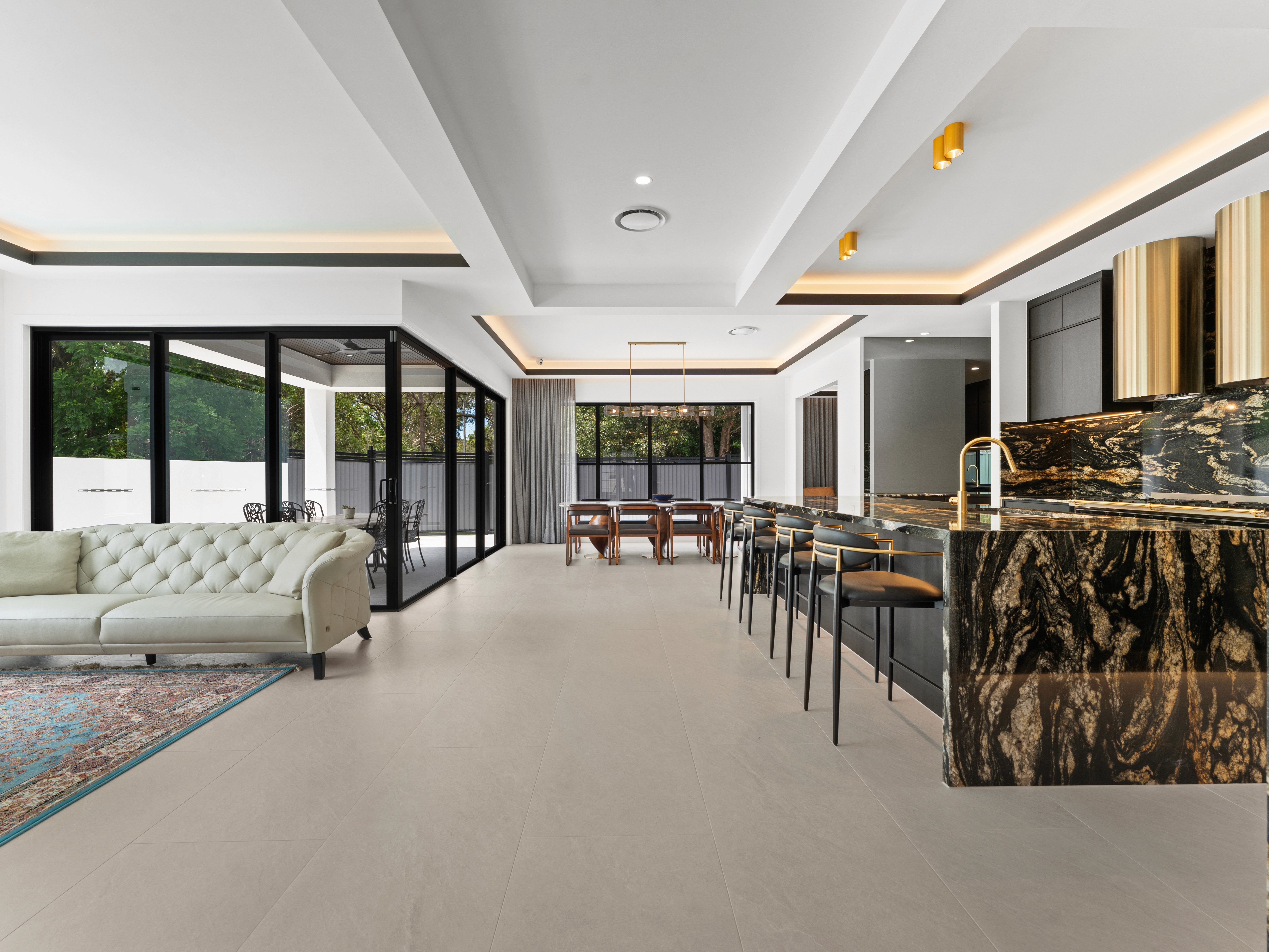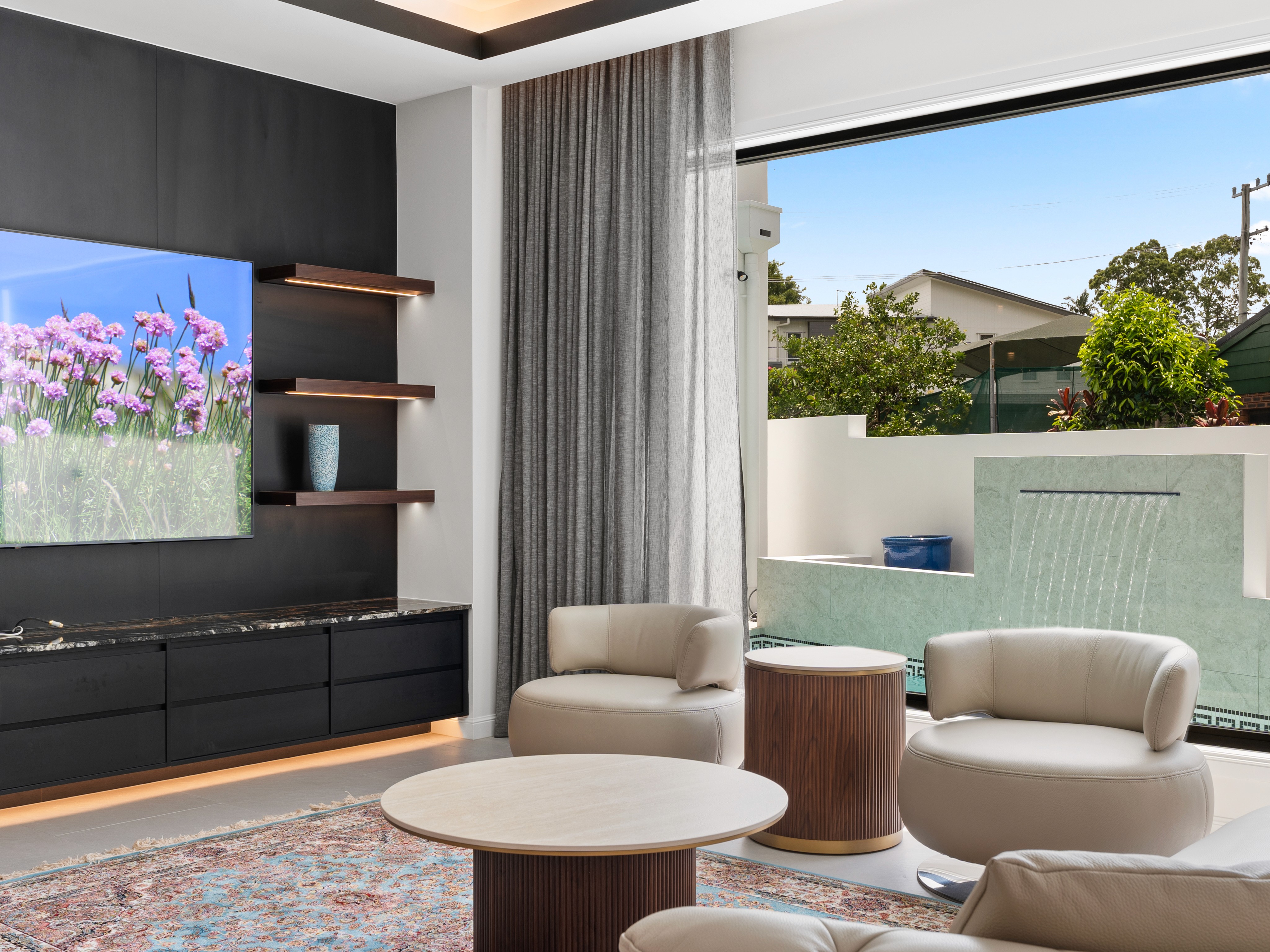 This two-storey home features a carefully considered layout with multiple living zones, a curved custom staircase, and high-end finishes throughout. The kitchen anchors the main living area with dramatic stone features and integrated appliances, while custom joinery and feature lighting are carried through every space.