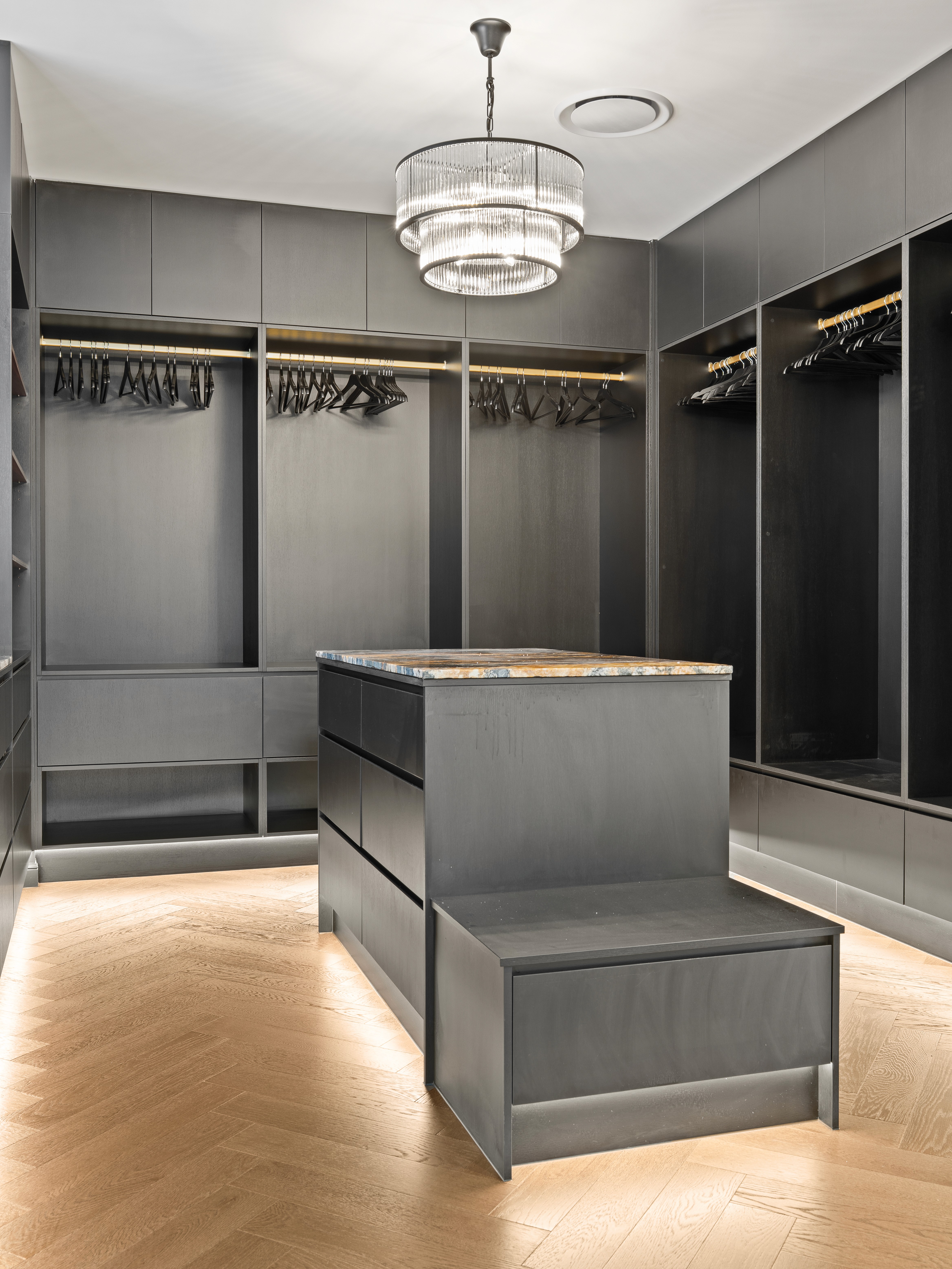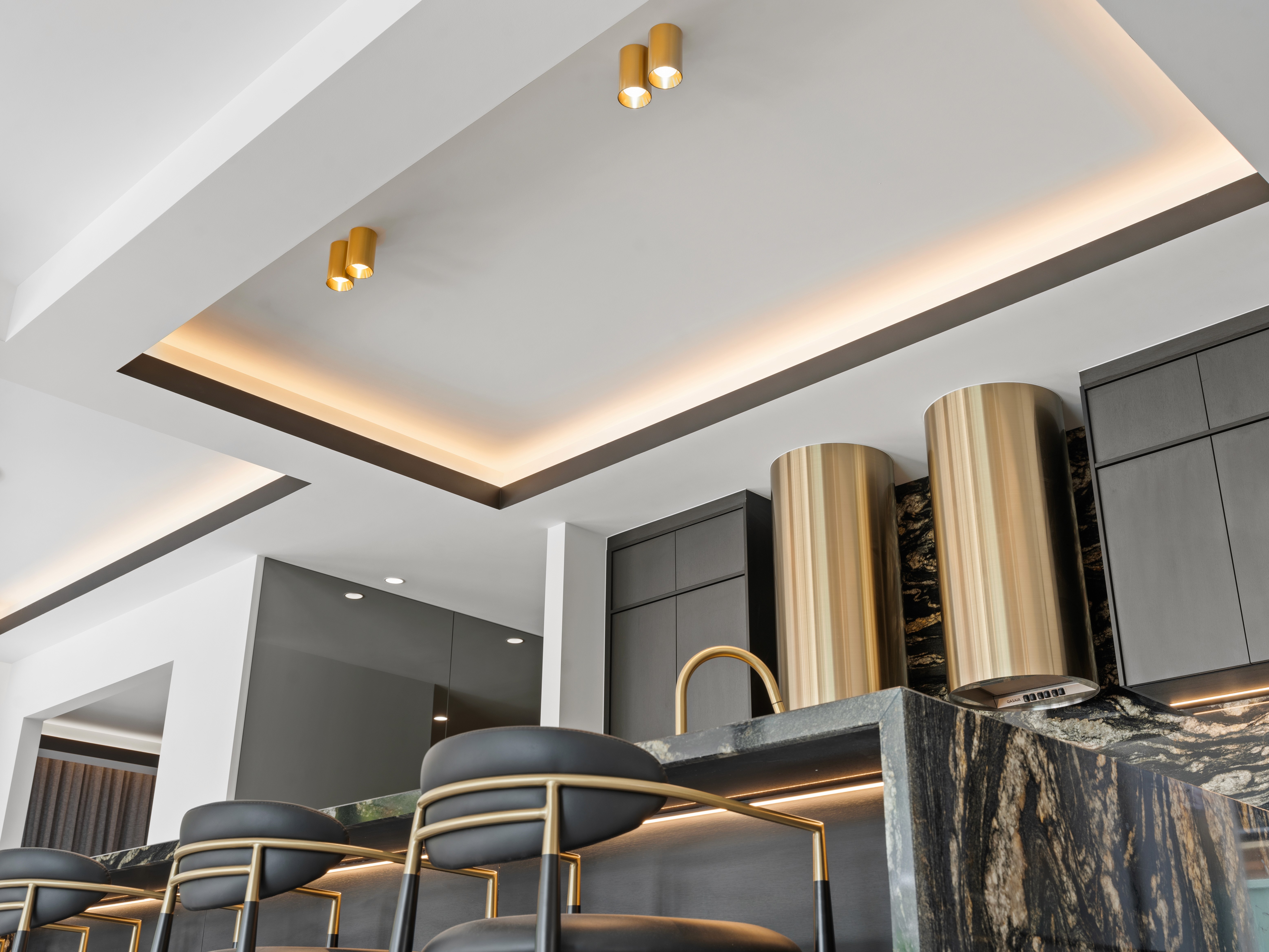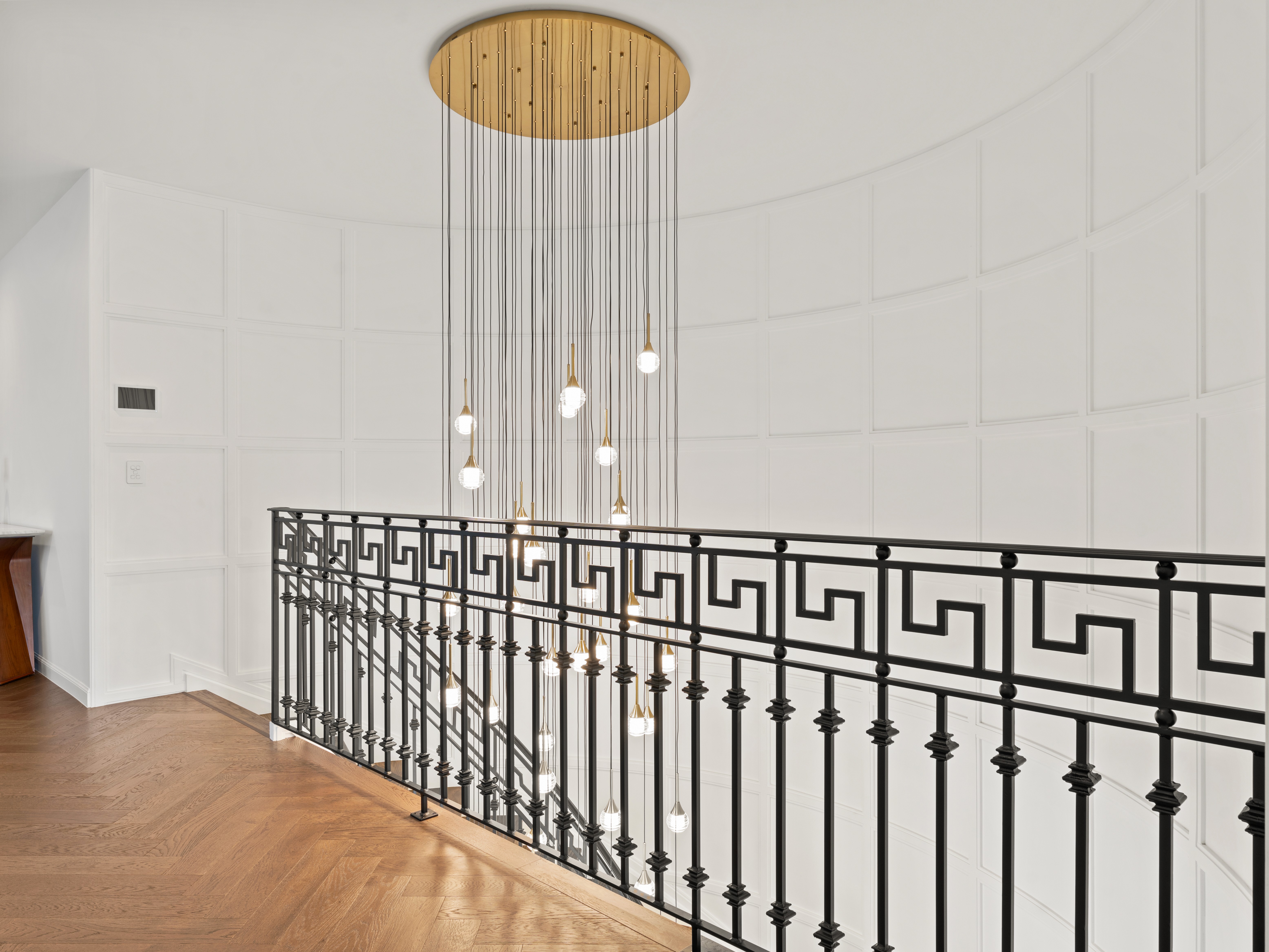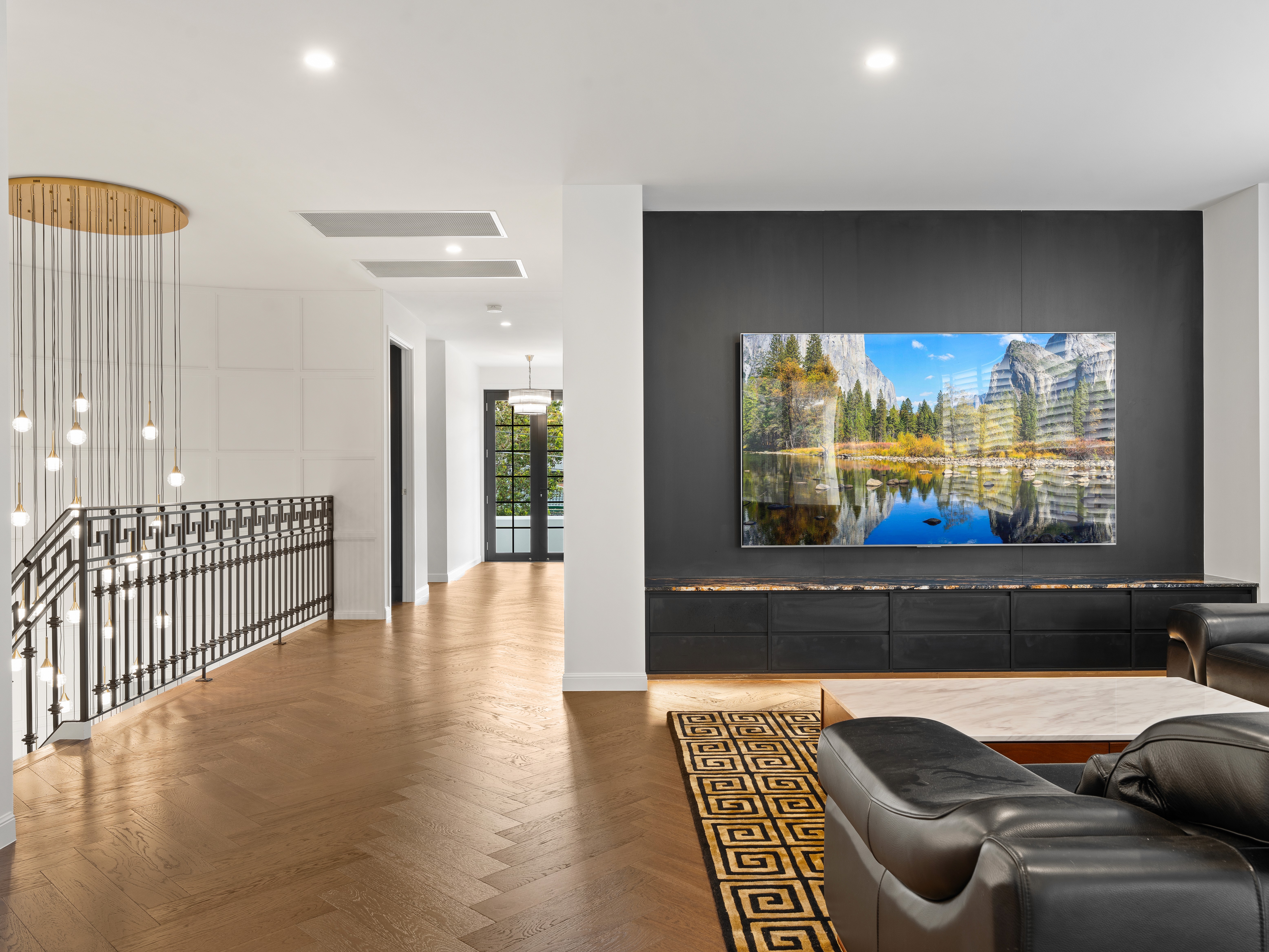 This two-storey home features a carefully considered layout with multiple living zones, a curved custom staircase, and high-end finishes throughout. The kitchen anchors the main living area with dramatic stone features and integrated appliances, while custom joinery and feature lighting are carried through every space.