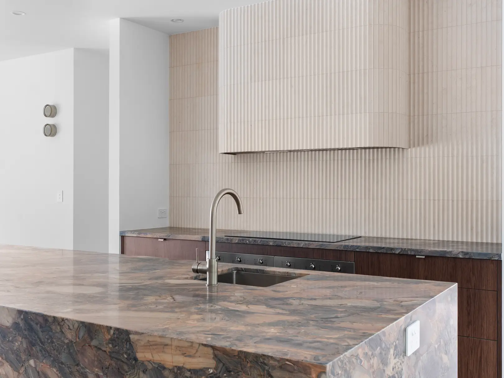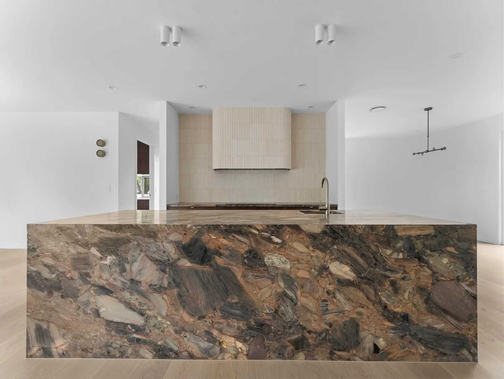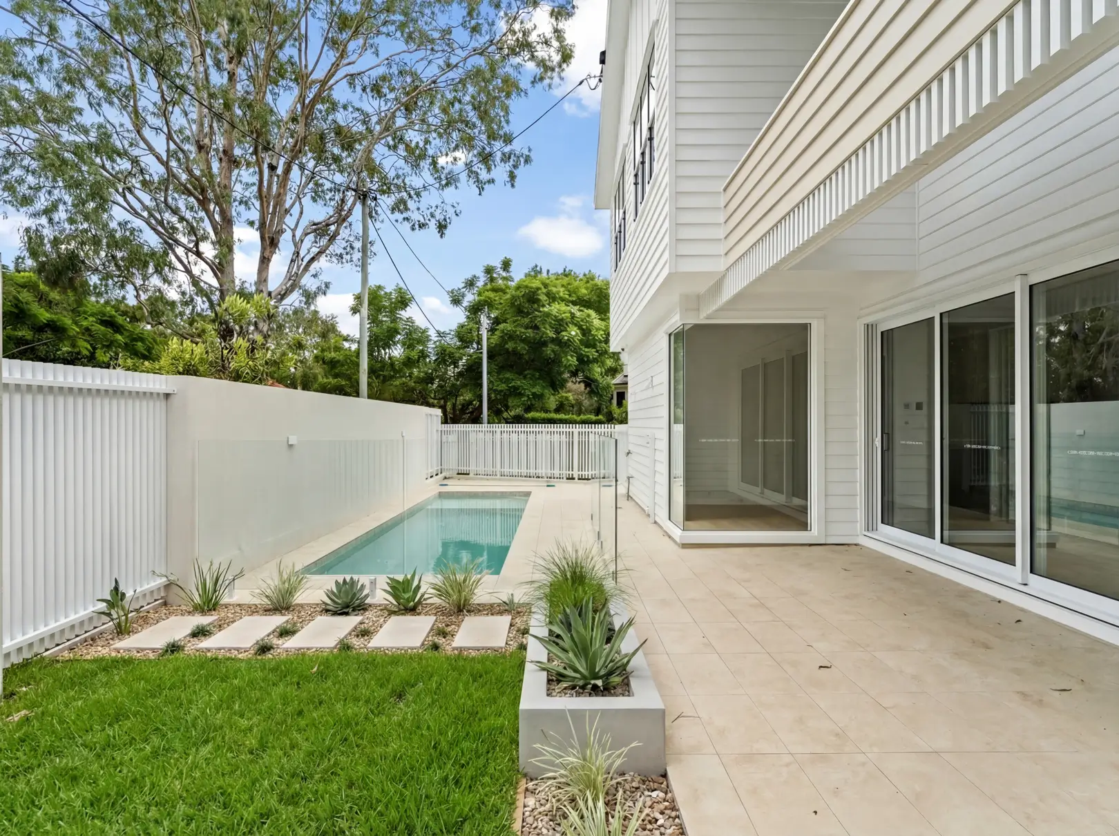 A contemporary custom home combining clean lines with natural materials. This two-storey home features a statement stone kitchen island, textured fluted cabinetry, and timber vanity details throughout. Neutral tones and natural finishes create warmth while maintaining a refined, modern aesthetic. The indoor-outdoor connection includes pool access and covered entertaining areas designed for Brisbane's climate.