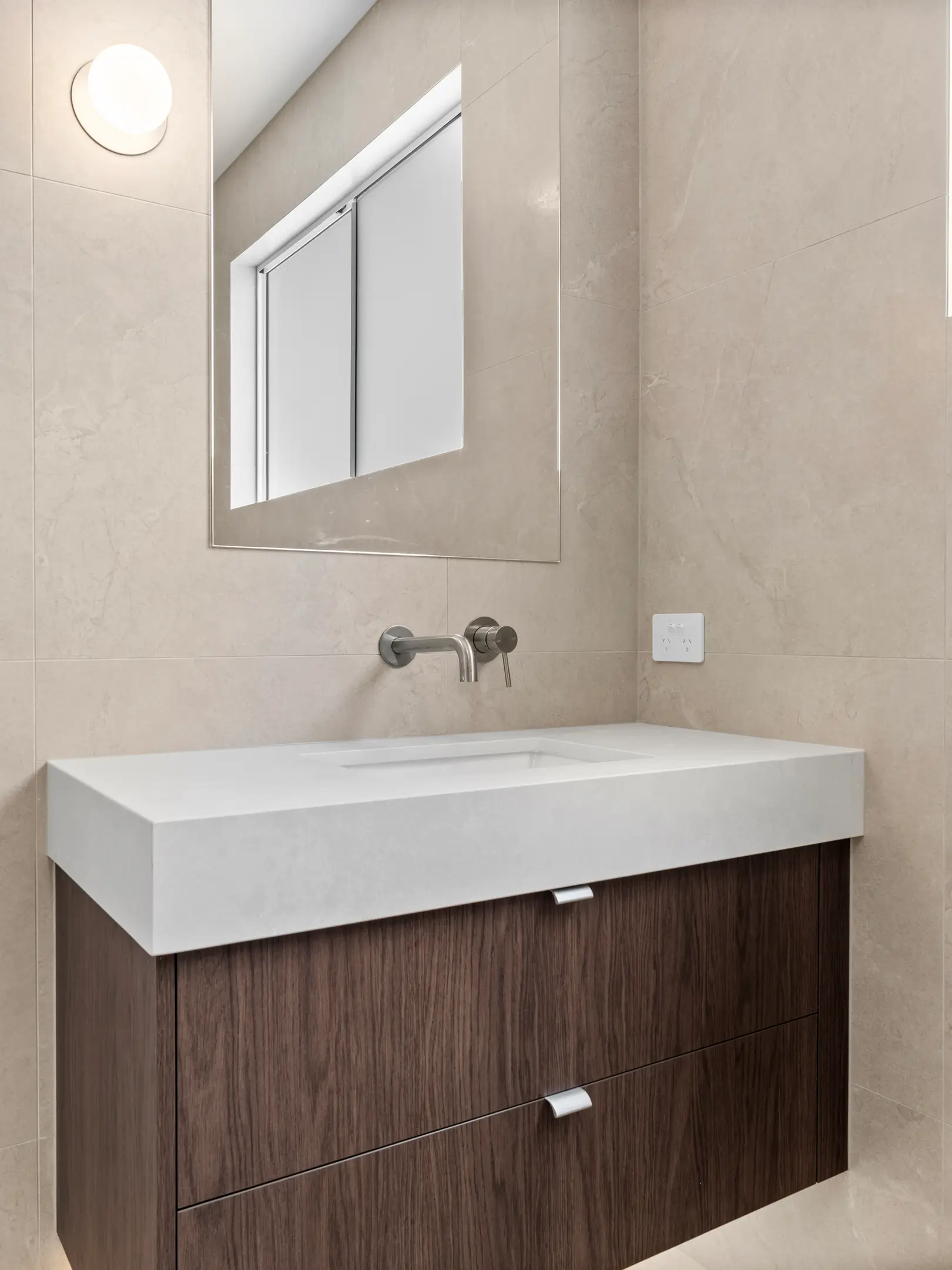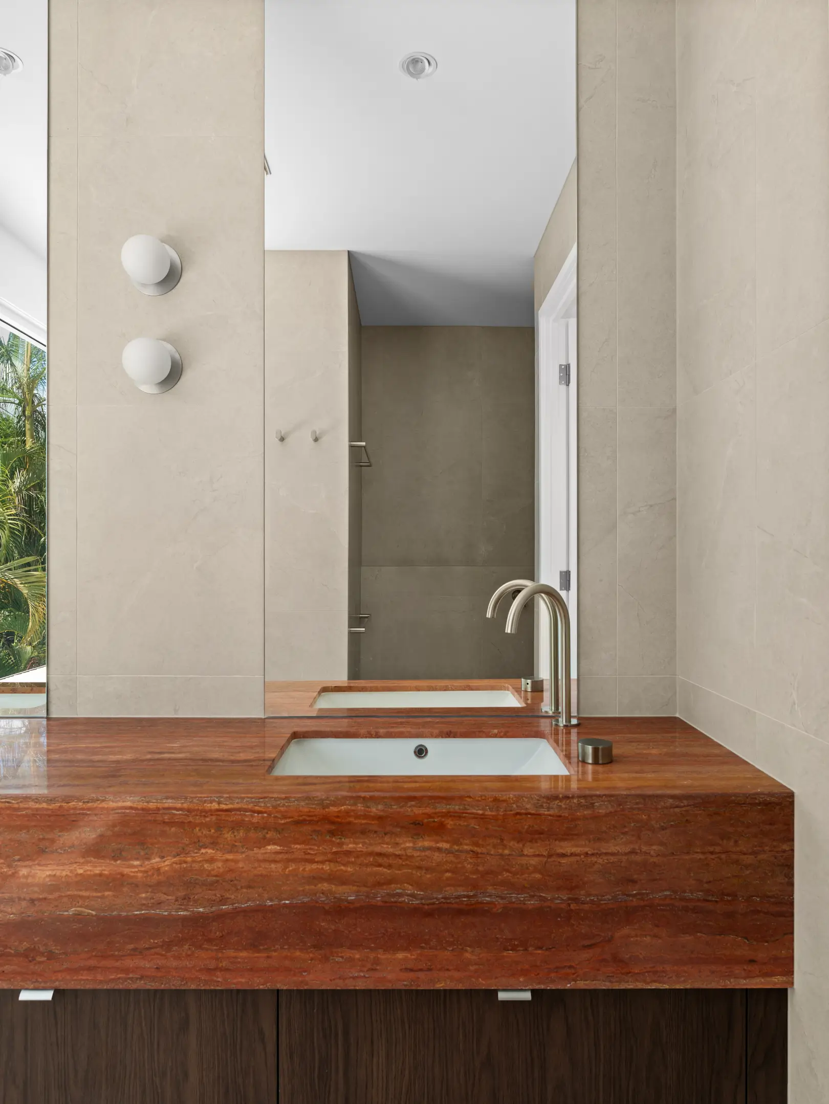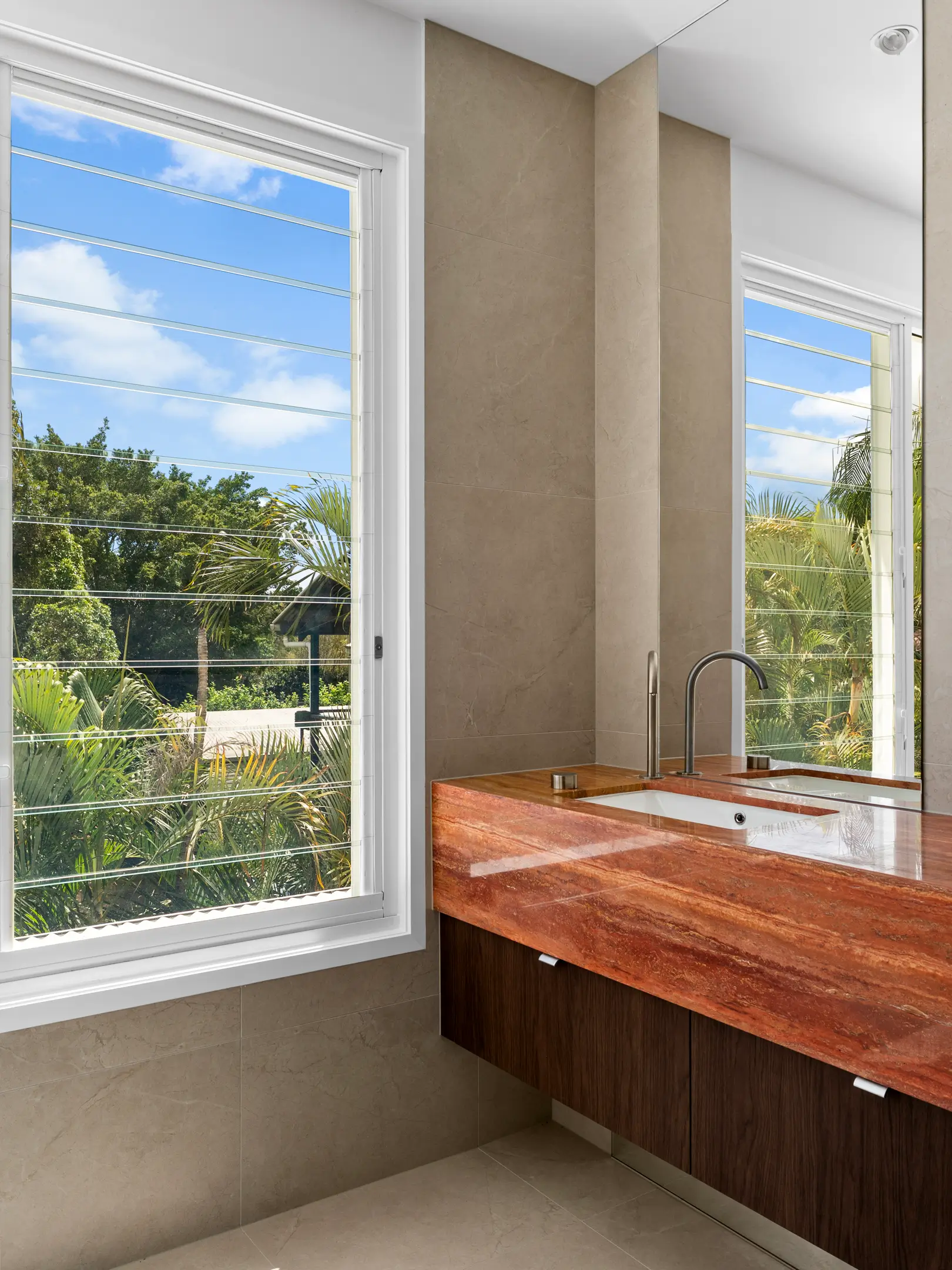 A contemporary custom home combining clean lines with natural materials. This two-storey home features a statement stone kitchen island, textured fluted cabinetry, and timber vanity details throughout. Neutral tones and natural finishes create warmth while maintaining a refined, modern aesthetic. The indoor-outdoor connection includes pool access and covered entertaining areas designed for Brisbane's climate.