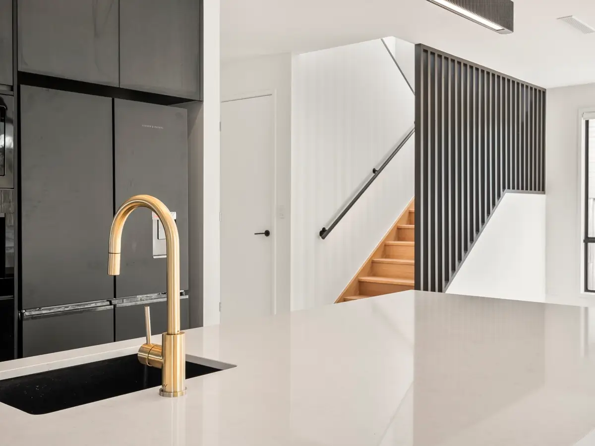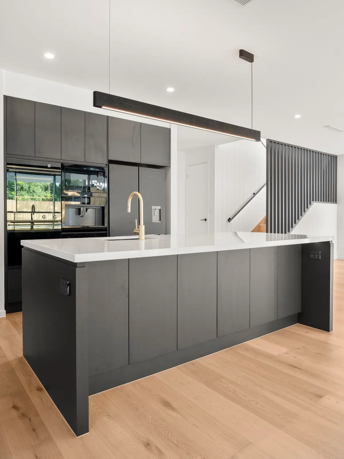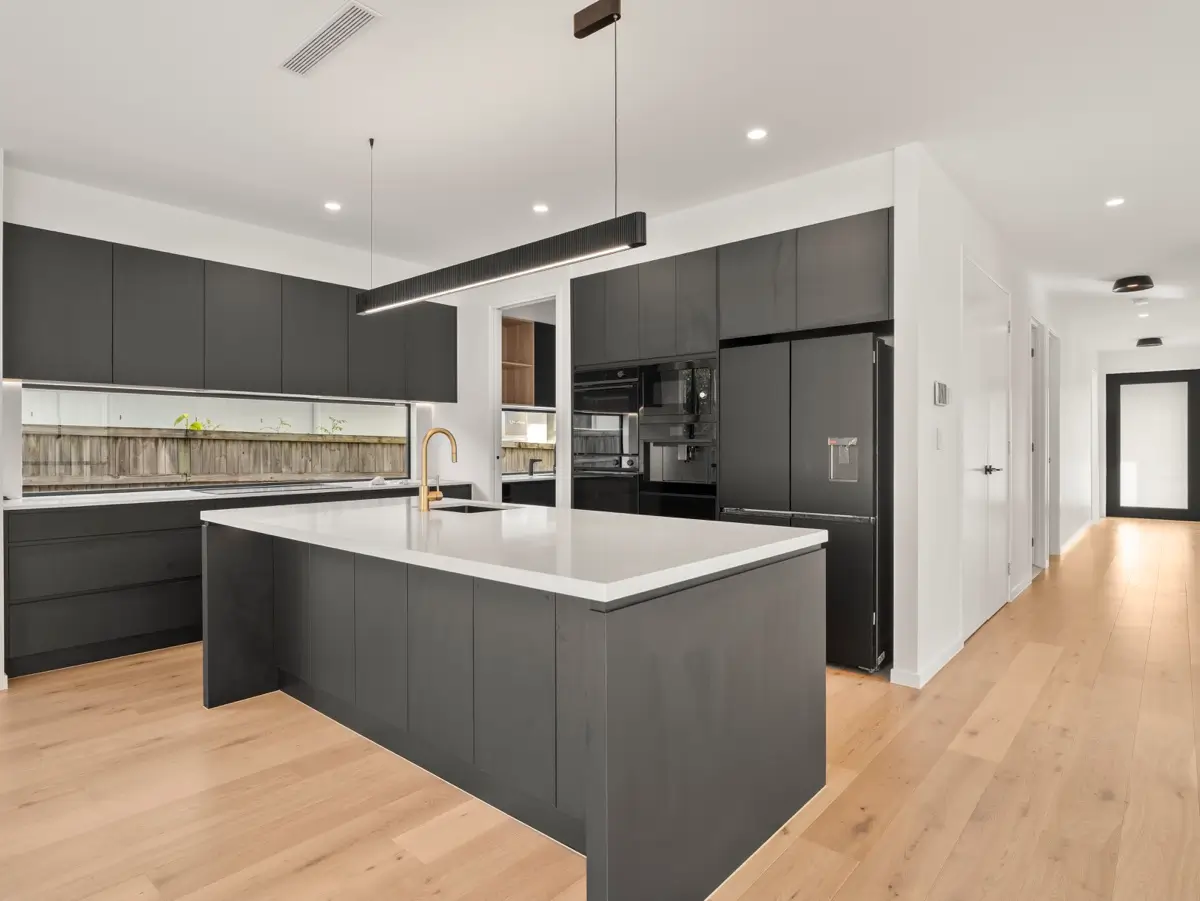 Inside, the design continues with warm timber flooring balanced by sleek black and neutral tones. The kitchen makes a bold statement with dark cabinetry, light stone benchtops, and brushed gold fittings, while the bathrooms feature floating timber vanities and matte black tapware for a soft yet modern edge. Thoughtful material layering and detailing define this home’s timeless, contemporary style.