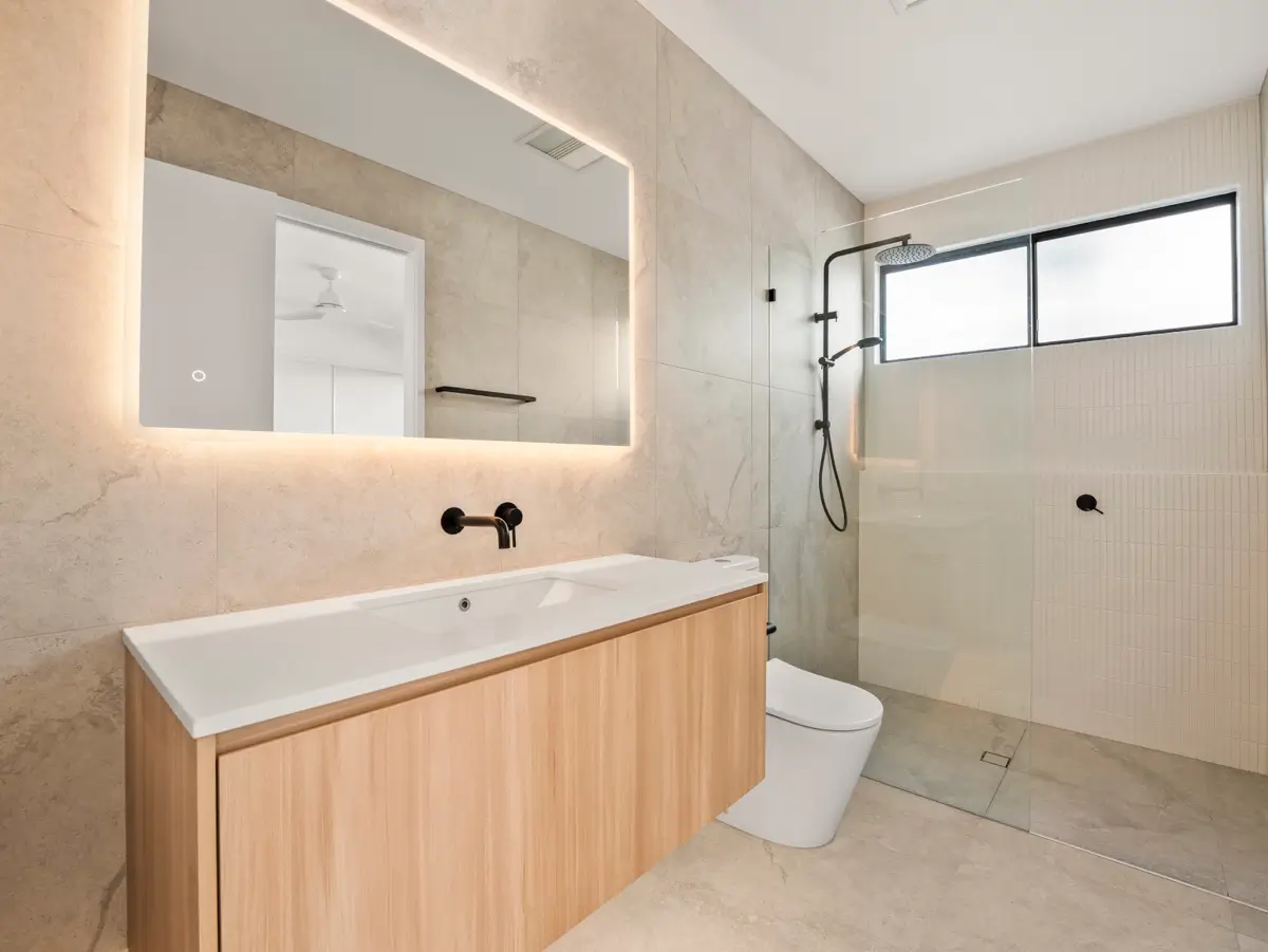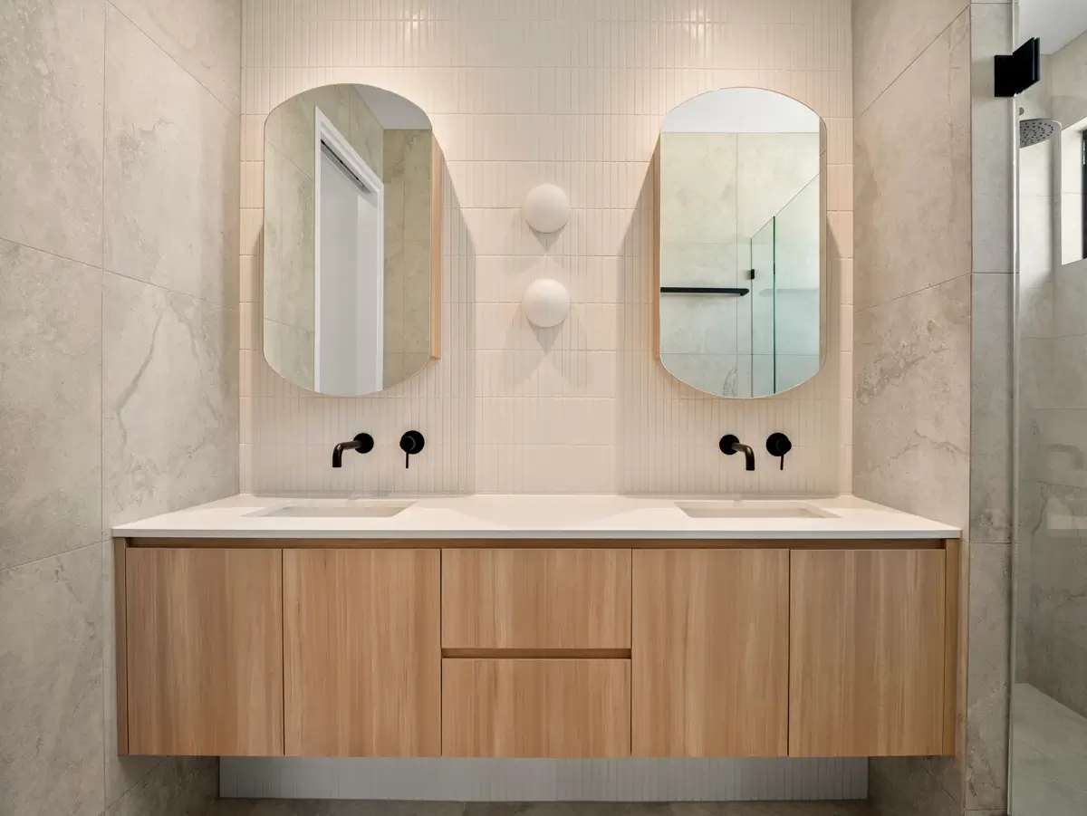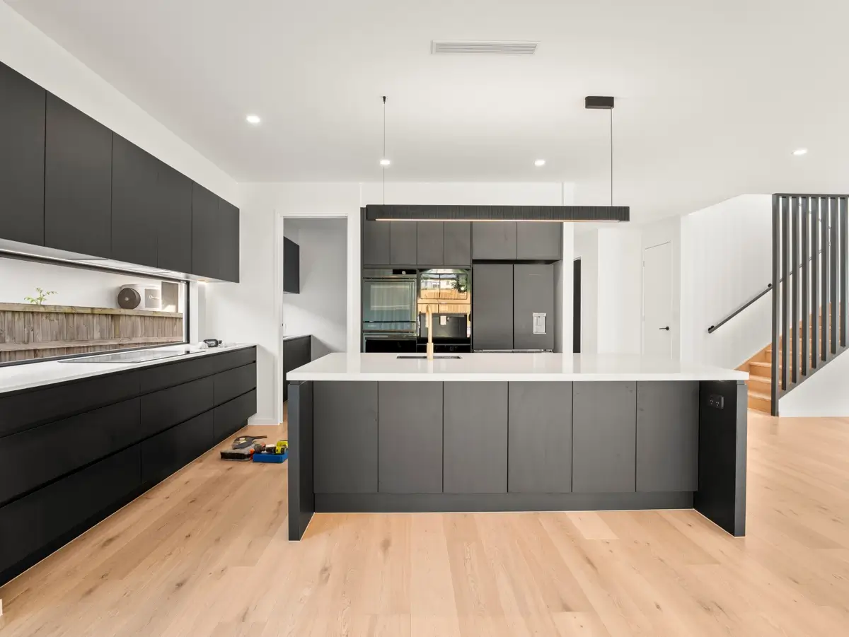Inside, the design continues with warm timber flooring balanced by sleek black and neutral tones. The kitchen makes a bold statement with dark cabinetry, light stone benchtops, and brushed gold fittings, while the bathrooms feature floating timber vanities and matte black tapware for a soft yet modern edge. Thoughtful material layering and detailing define this home’s timeless, contemporary style.