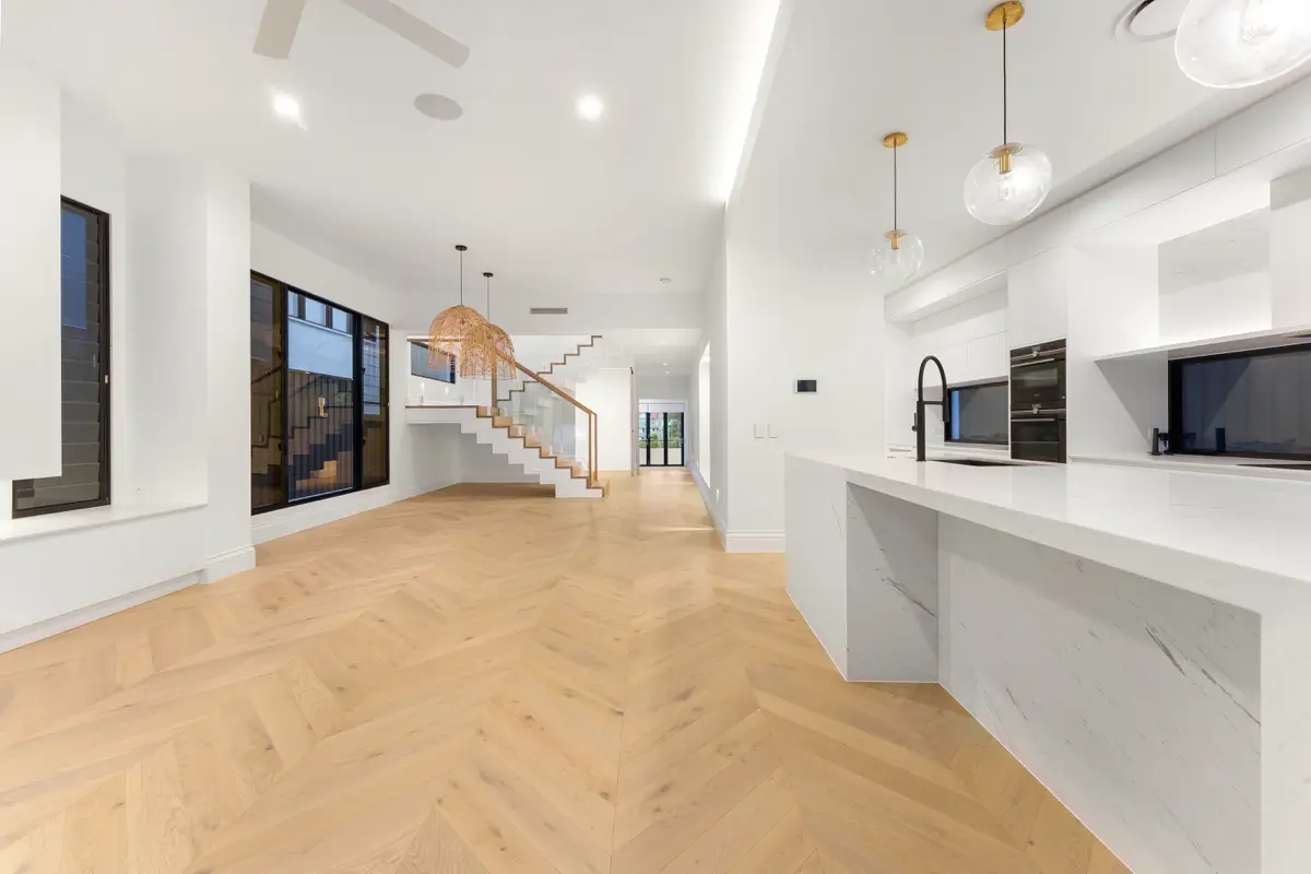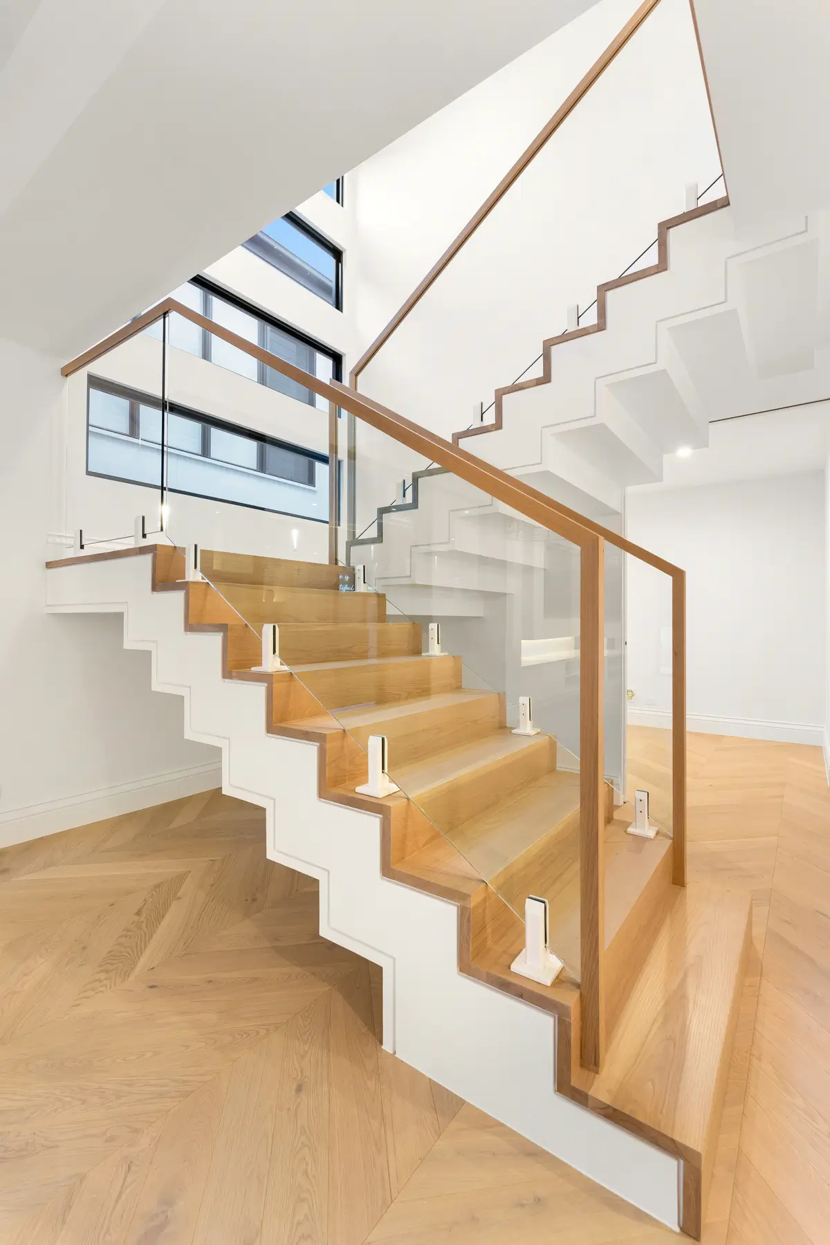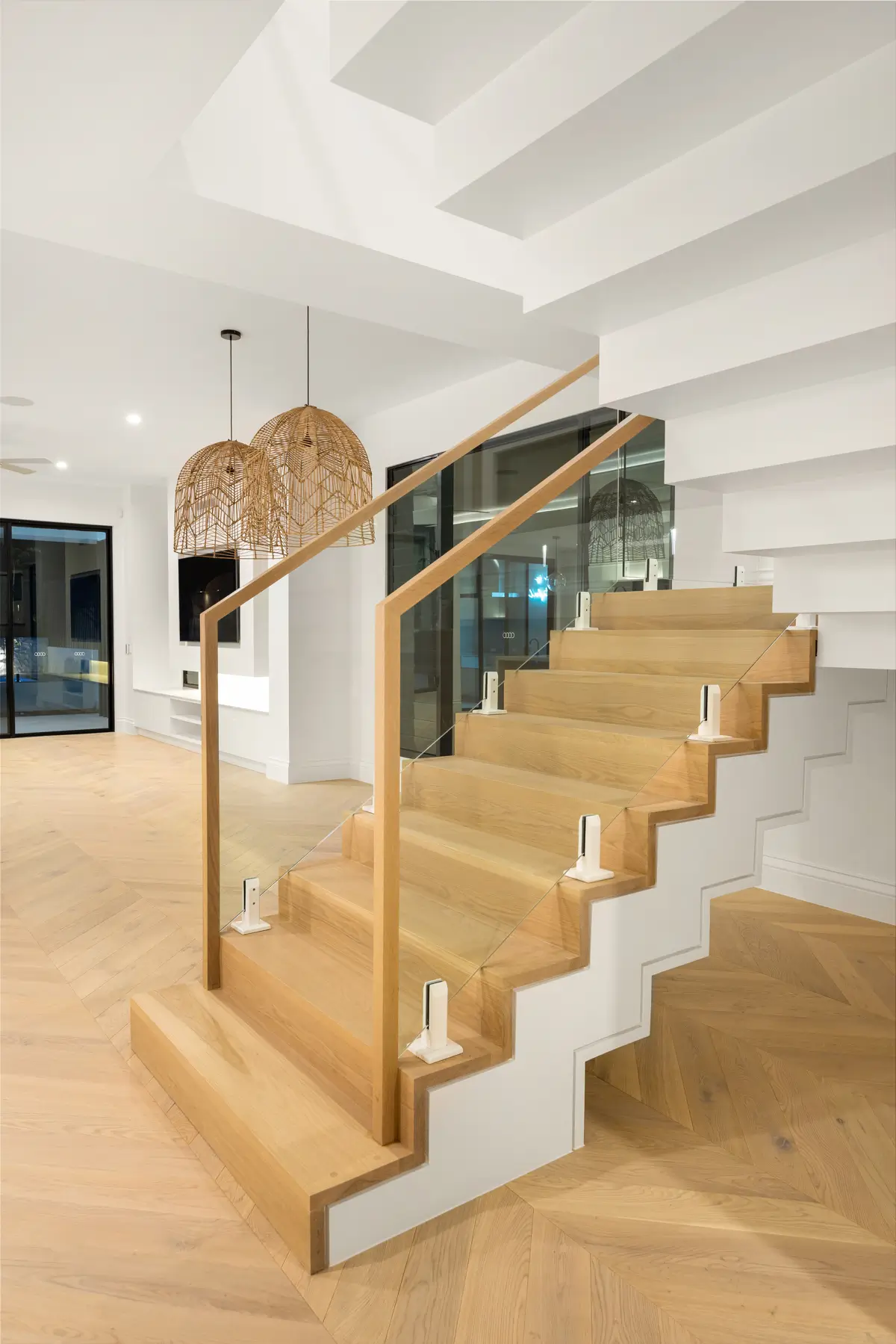 Inside, oak herringbone flooring and a statement staircase with glass balustrades and timber handrails establish a modern, cohesive tone. Black window framing and subtle feature lighting continue throughout, complementing the home’s clean palette.