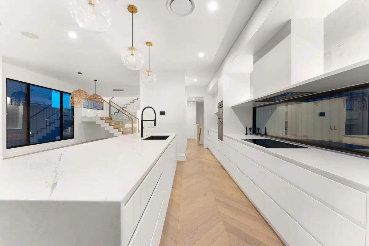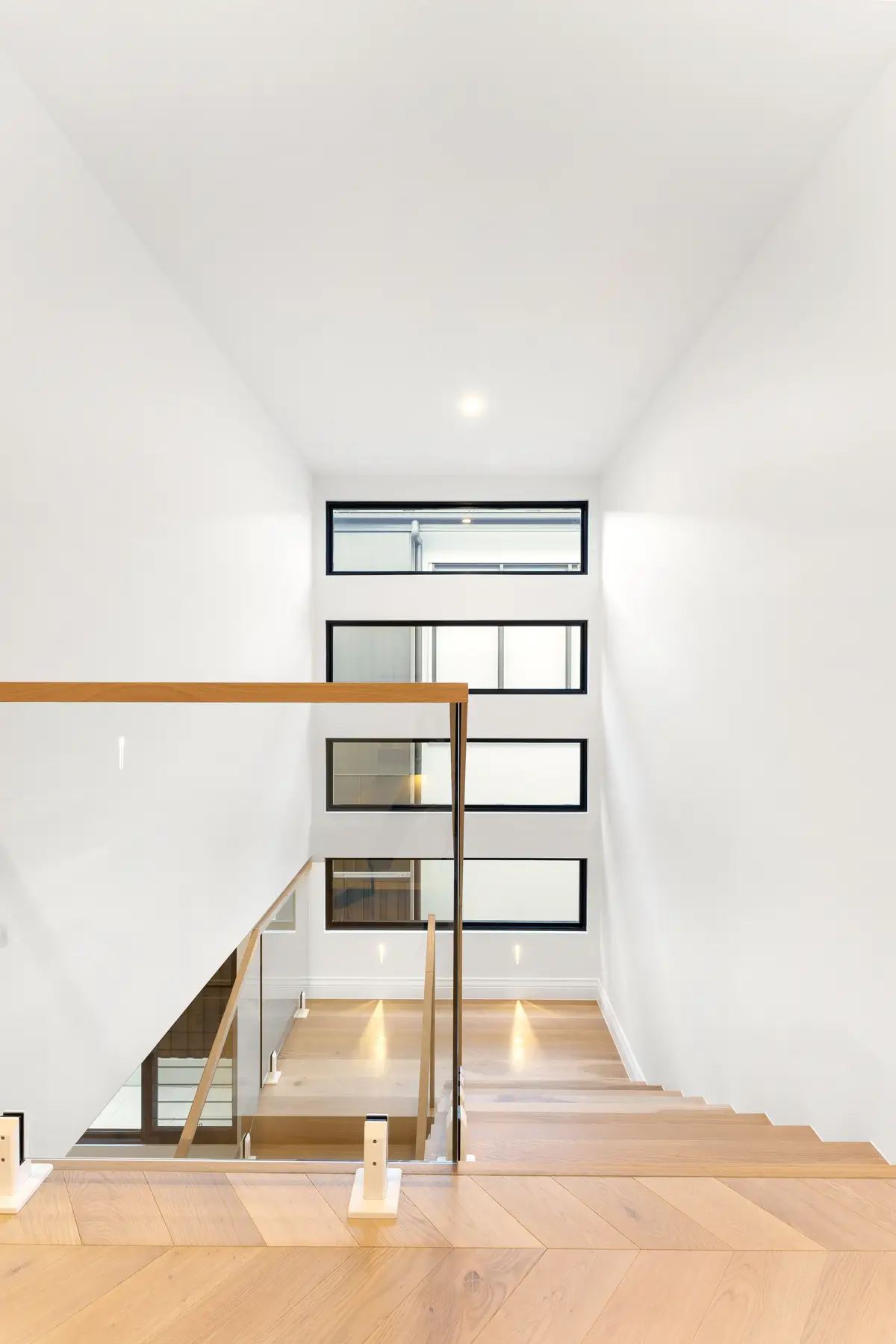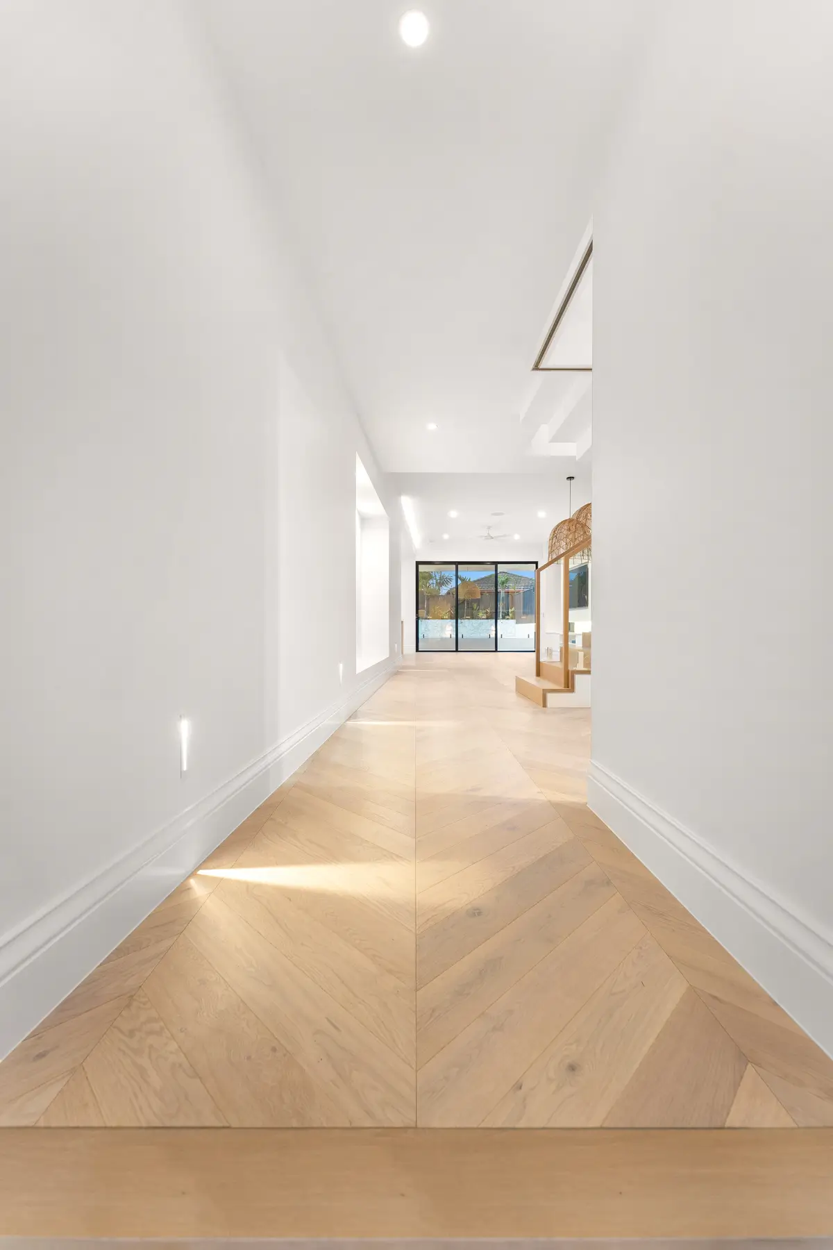 Inside, oak herringbone flooring and a statement staircase with glass balustrades and timber handrails establish a modern, cohesive tone. Black window framing and subtle feature lighting continue throughout, complementing the home’s clean palette.
