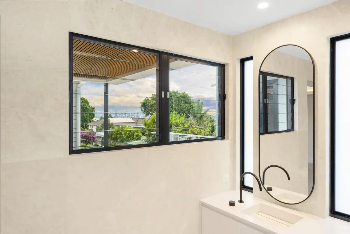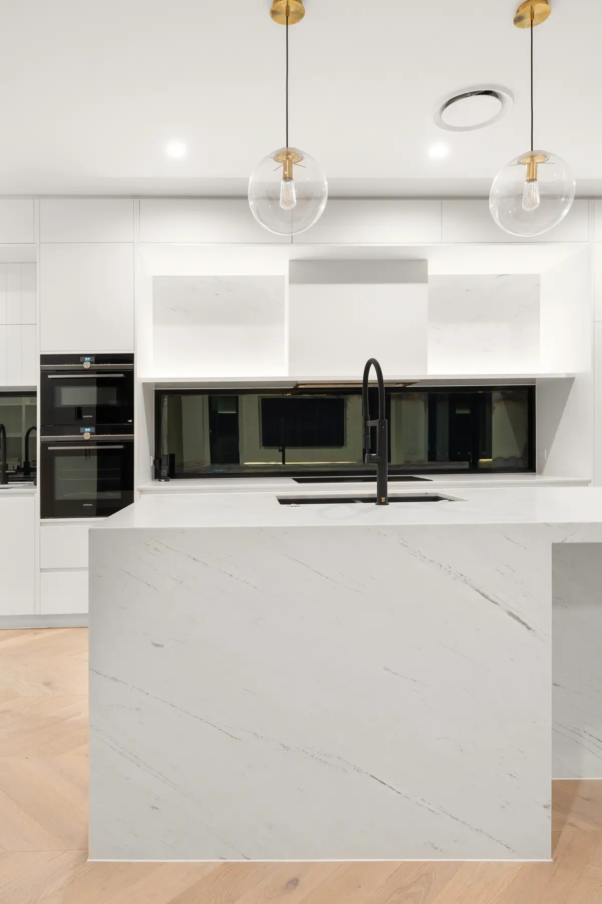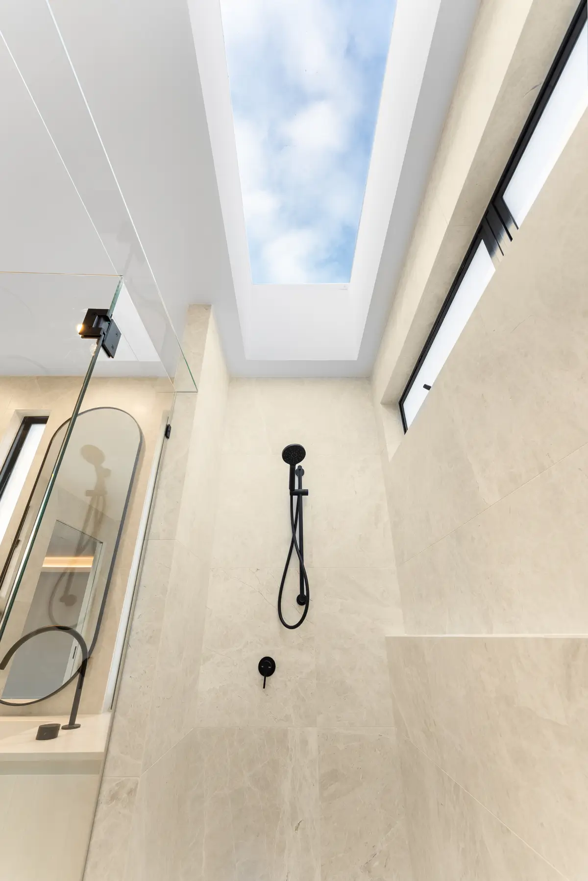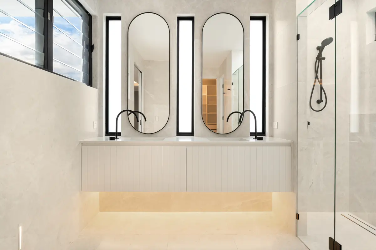 The kitchen features white 2Pac cabinetry with dark accents and connects to outdoor areas overlooking the pool, with a feature stone wall. Bathrooms include custom mirrors, skylights and refined finishes that complete the home’s polished, contemporary character.