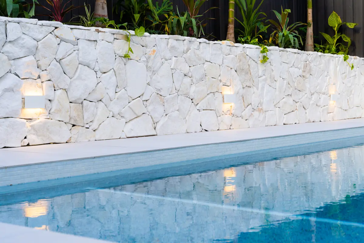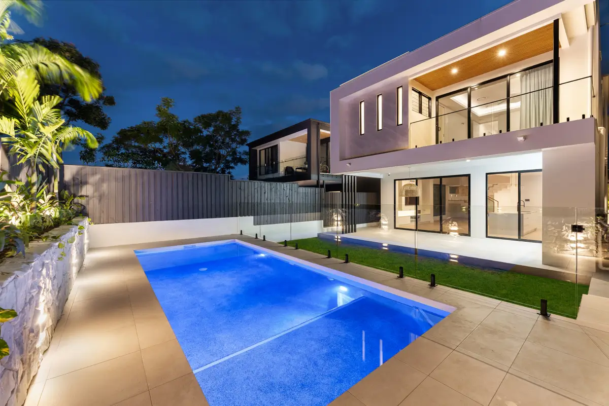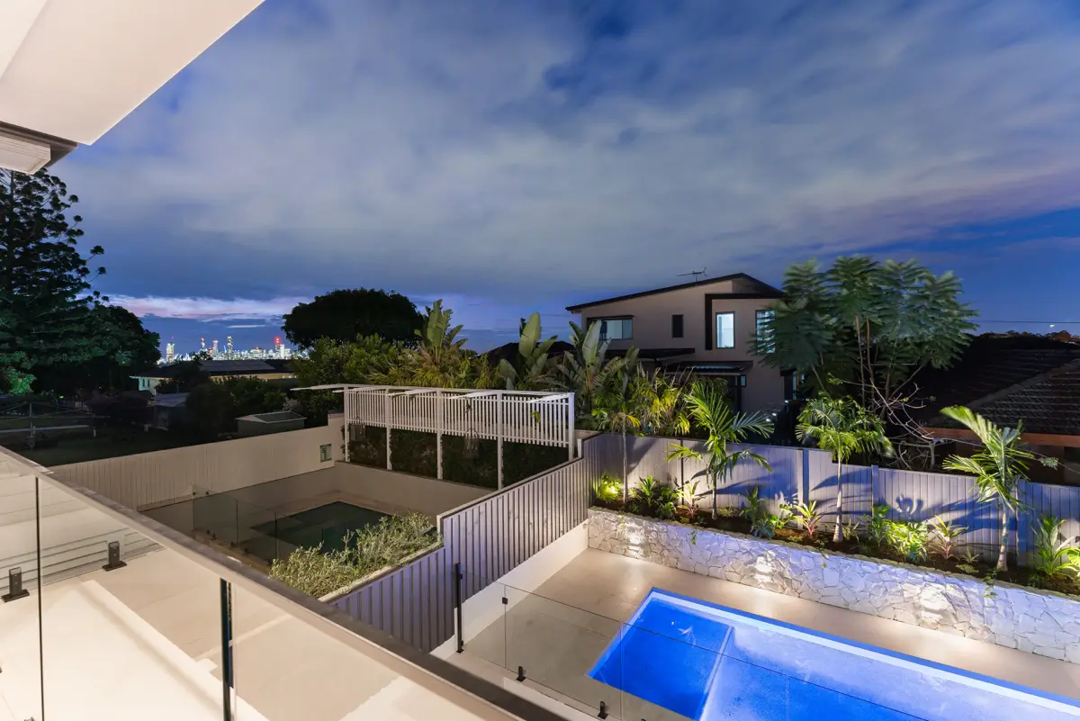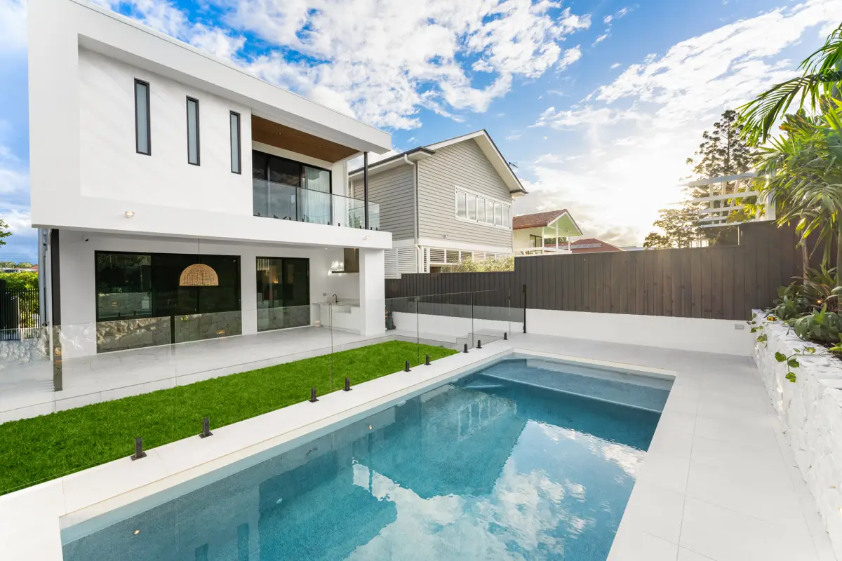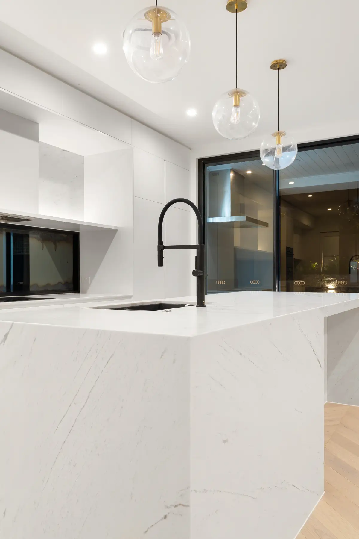 The kitchen features white 2Pac cabinetry with dark accents and connects to outdoor areas overlooking the pool, with a feature stone wall. Bathrooms include custom mirrors, skylights and refined finishes that complete the home’s polished, contemporary character.