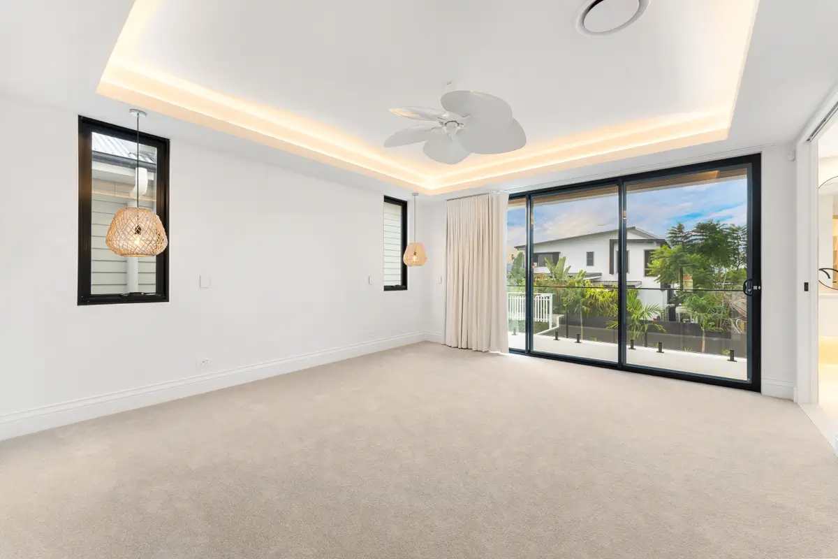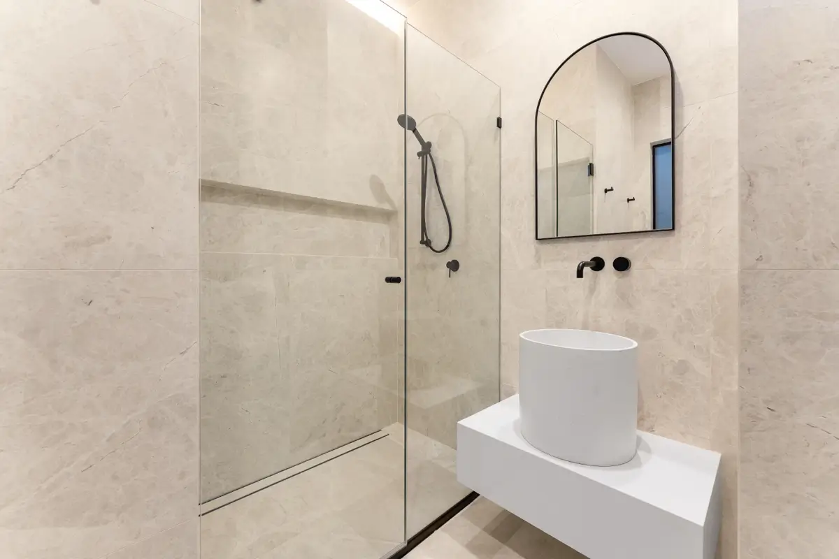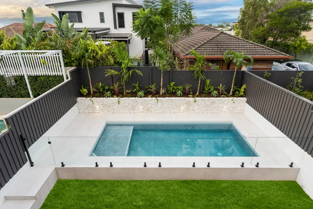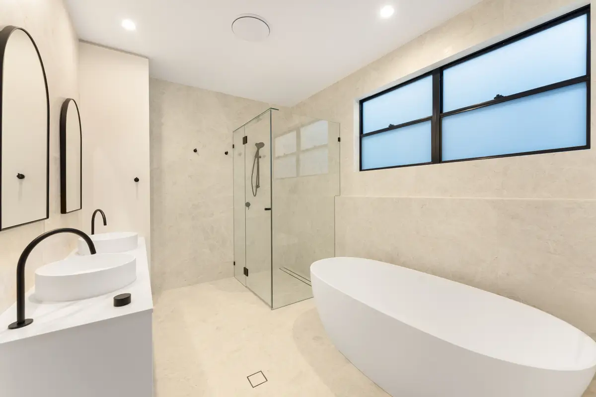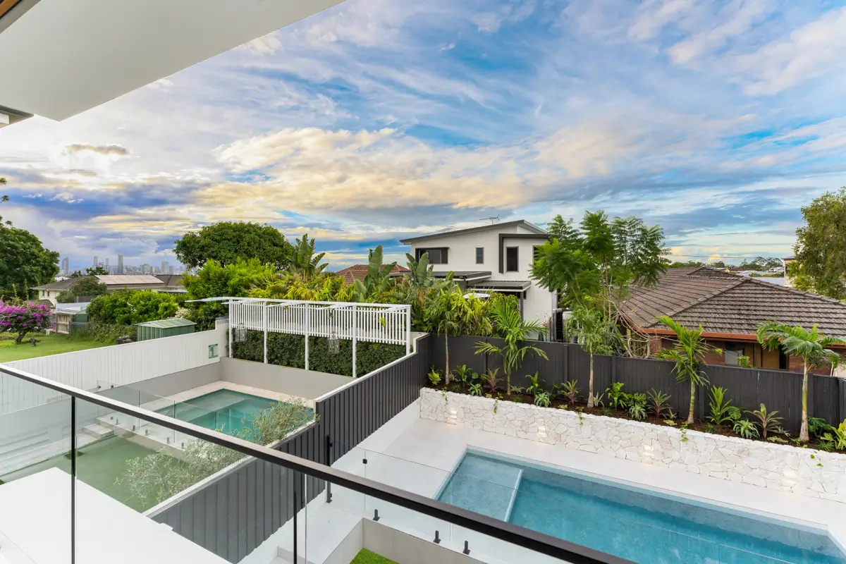 The kitchen features white 2Pac cabinetry with dark accents and connects to outdoor areas overlooking the pool, with a feature stone wall. Bathrooms include custom mirrors, skylights and refined finishes that complete the home’s polished, contemporary character.