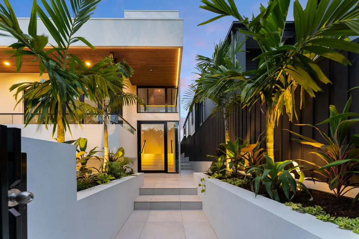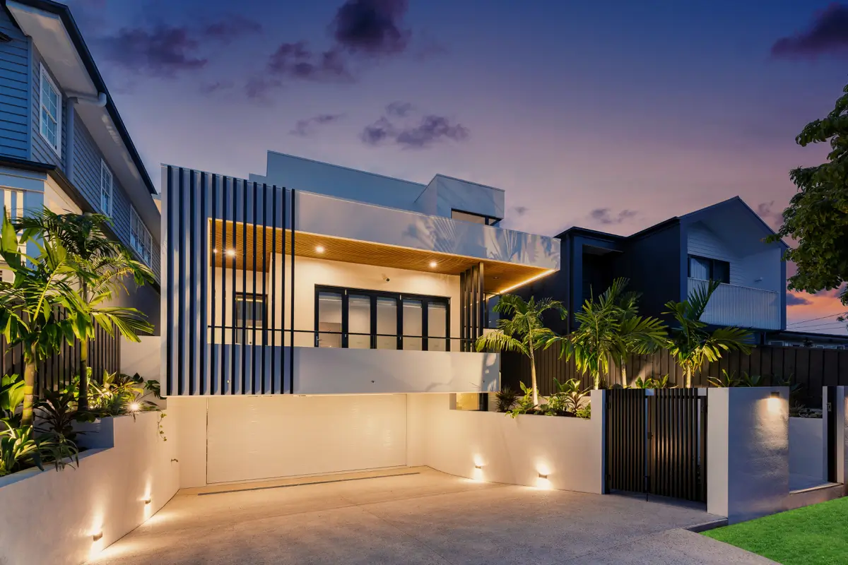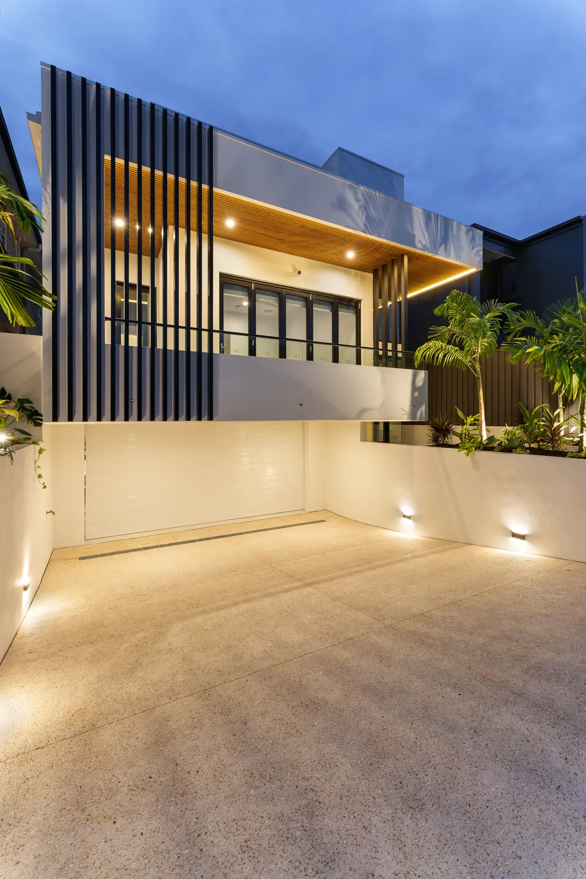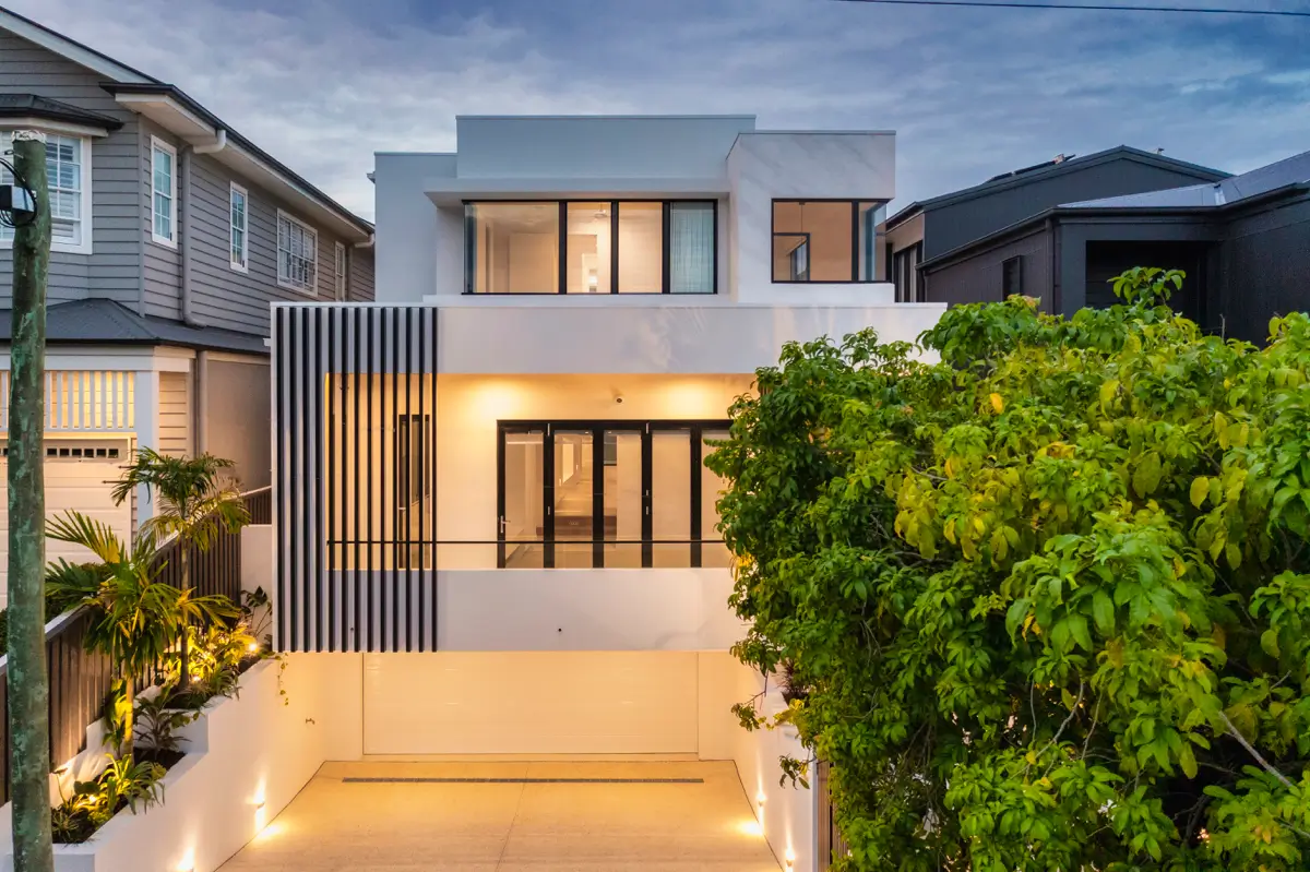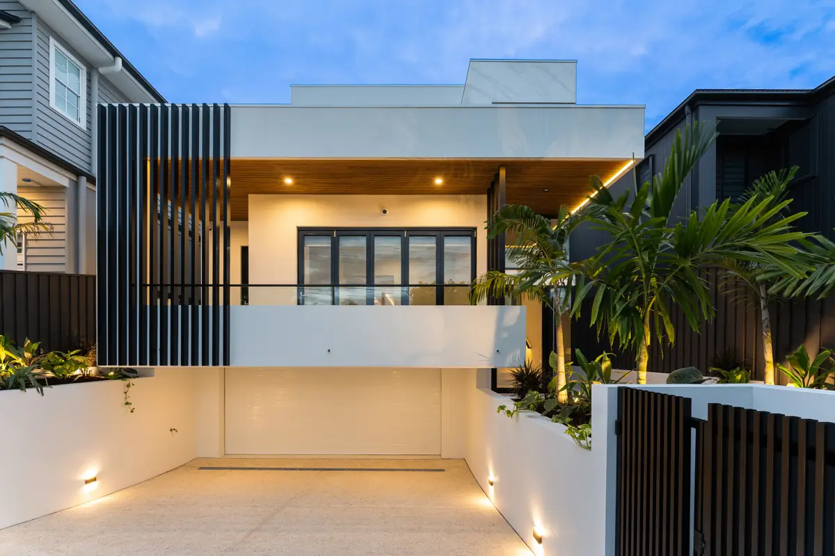 Waverley House is a contemporary three-level home designed to make full use of its sloping site, with an undercroft garage creating generous living space above. The facade combines crisp white surfaces, black detailing and landscaping that softens the structure and enhances its street presence.